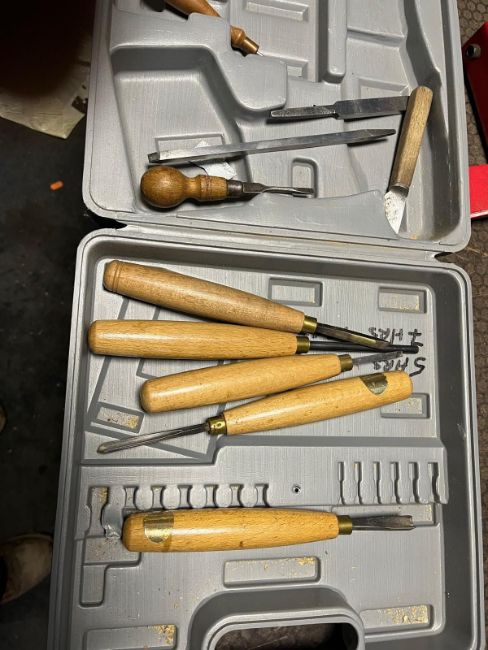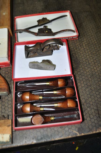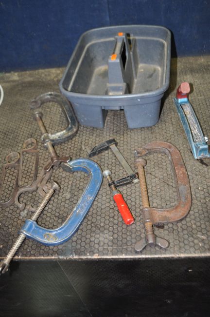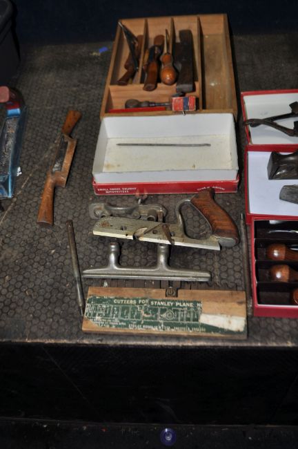 A COLLECTION OF PLANES AND CLAMPS including a Stanley No.50 plough plane with cutters, a Preston's and Co bullnose plane, two sets of hand carving chisels, a Record No.51 spokeshave, three wooden spokeshaves, two Record and other clamps, etc