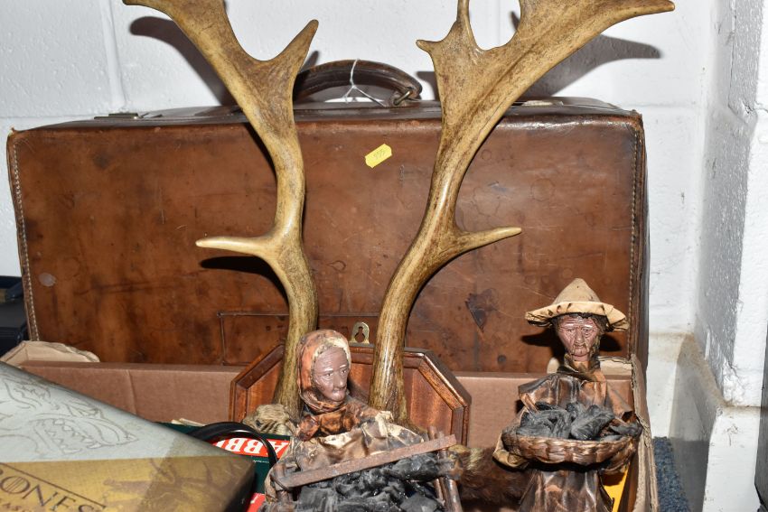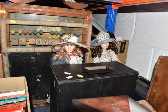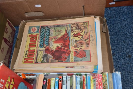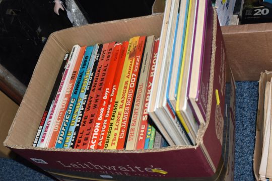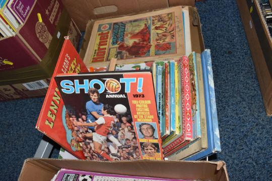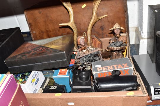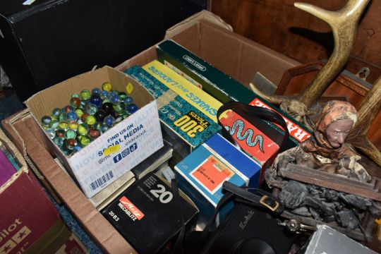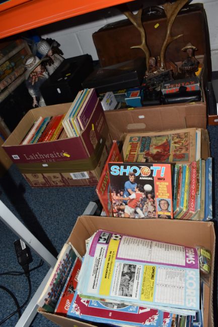 FOUR BOXES AND LOOSE BOOKS, VINTAGE FOOTBALL MAGAZINES AND SUNDRIES, to include Pentax 8 x 42 DCF binoculars, brass telescope, Kodak instamatic camera, Carl Zeiss Jena DDR S1:3.5f=135 camera lens in the box, antlers mounted on a wooden wall plaque, approximately one hundred marbles, Scrabble, vintage suitcase, two porcelain dolls, approximately seventy-five Aston Villa football programmes date range 1970s, Shoot football magazines, comics include The Hornet, Beano, vintage books and annuals include Puffin books, Armada books, Dandy, Beano, Tell me Why, Look and Learn, Action book for Boys, Topper, etc. (4 boxes + loose), (sd/af)