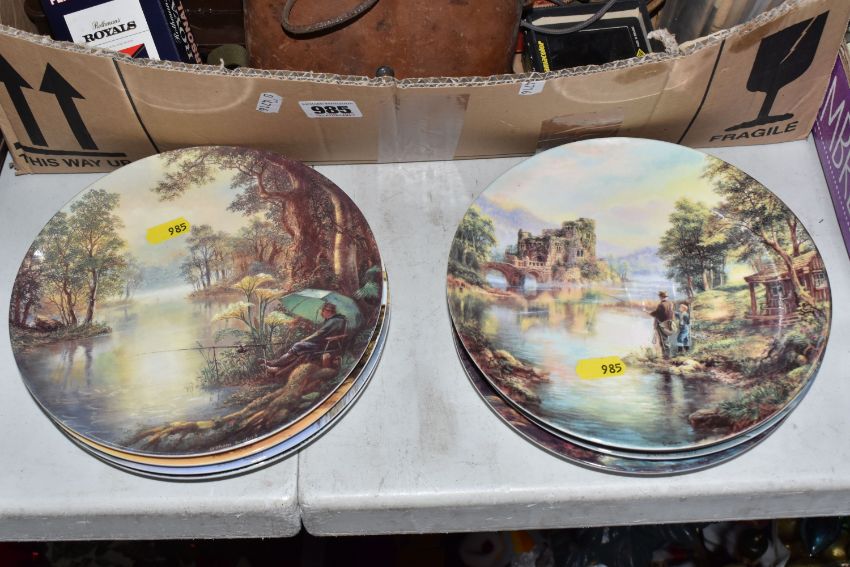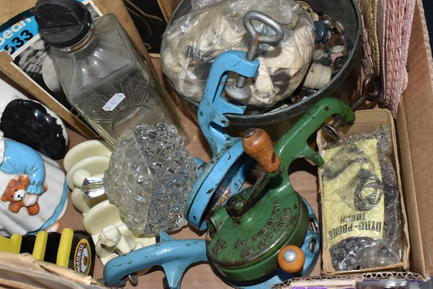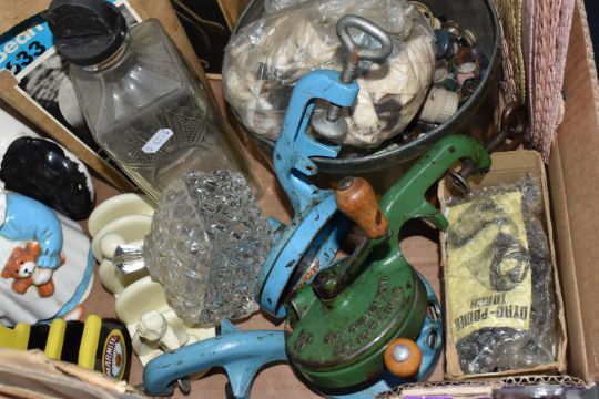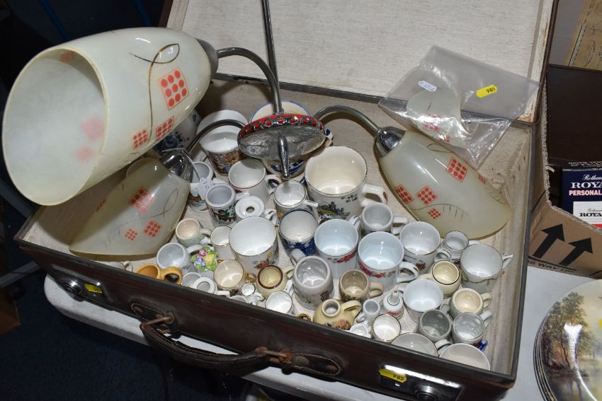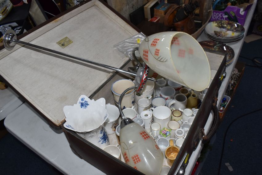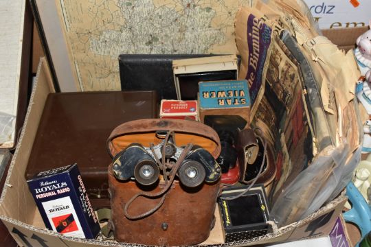 TWO BOXES, A SUITCASE AND LOOSE CERAMICS, GLASS, METALWARE AND SUNDRY ITEMS, to include a mid-twentieth century ceiling light fitting with three glass shades (one broken), a cased pair of Bausch & Lomb military binoculars no 36379, a pair of Staffordshire style spaniels, five Spong bean slicers - two with boxes, a cased Ebbco sextant, a Weston Master III exposure meter, Marmite and Lurpak advertising toast racks, eight fishing themed collectors plates, a vintage Globe Trotter suitcase, a boxed novelty Rothmans Royals personal radio in the form of a cigarette packet, etc (2 boxes + 1 case + loose) (sd, untested)