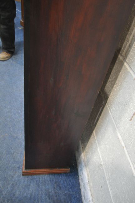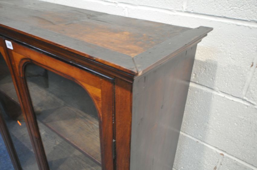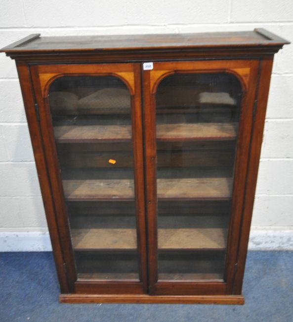 A 20TH CENTURY MAHOGANY BOOKCASE, the double glazed doors, enclosing three shelves, width 99cm x depth 33cm x height 129cm, condition report: historical marks, scuffs, splits, discolouration, other wear and usage
