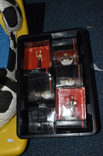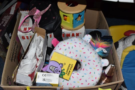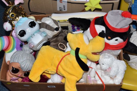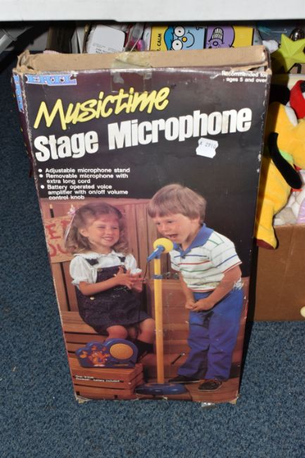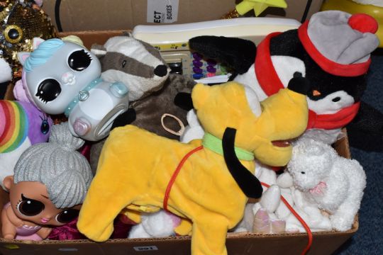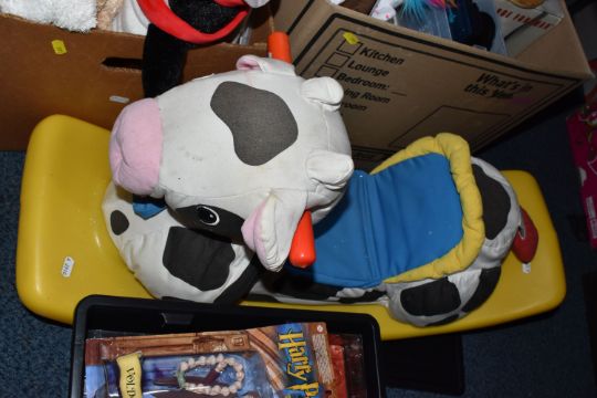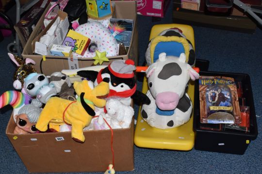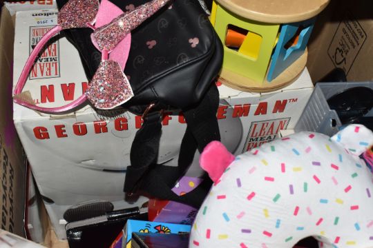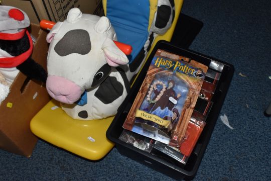 THREE BOXES AND LOOSE VINTAGE AND MODERN TOYS AND SUNDRIES to include a boxed Mattel Harry Potter and the Philosopher's Stone 'Voldemort' figurine, eight boxed T Company 'The Girls' figurines, a Little Tikes rocking cow, a folder including a large group of Lol doll cards, a reversible sequin rabbit, assorted beanie babies, a battery-powered duck hand puppet, a dancing singing penguin, Mcdonald Happy meal toys, a set of Wallace and Gromit kitchen scales, a boxed children's stage microphone, a George Foreman grill, etc (three boxes and loose) (s.d)