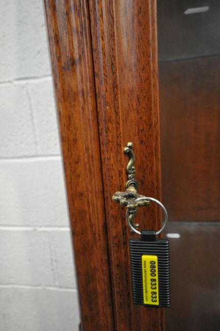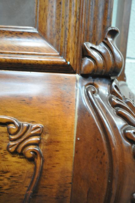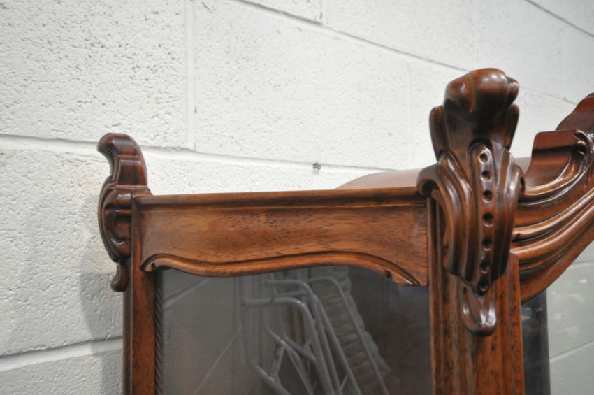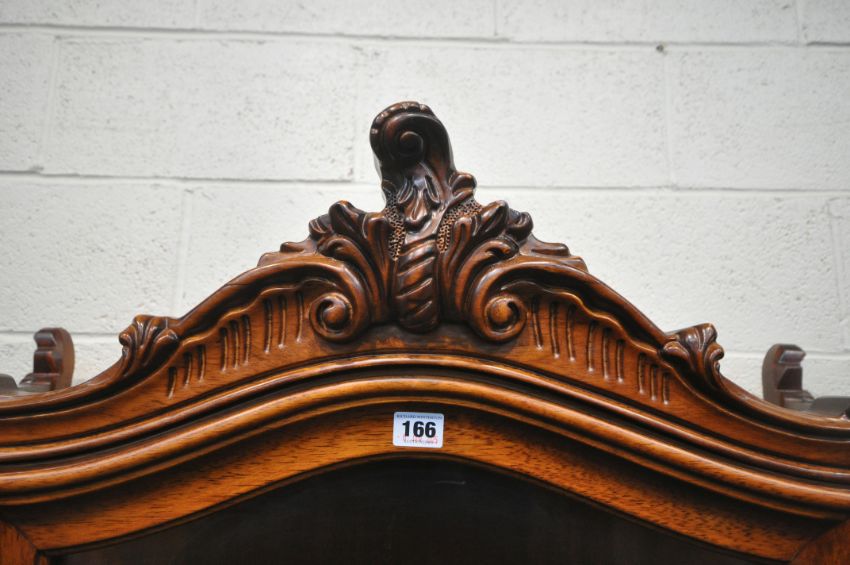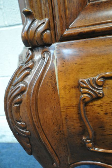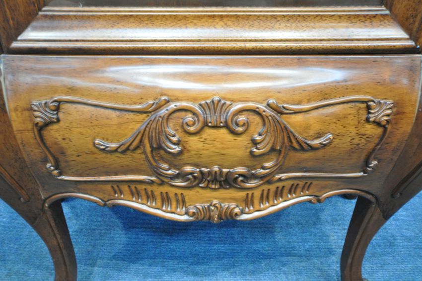 A REPRODUCTION ITALIAN STYLE DISPLAY CABINET, with scrolled crests and mounts, the single arched door enclosing two glass shelves, raised on cabriole legs, width 93cm x depth 41cm x height 186cm, condition report: one key, two repairs to the front, other signs of usage