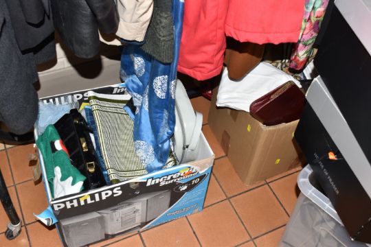 A SMALL QUANTITY OF LADIES' AND GENT'S CLOTHING ETC, to include a raw silk ivory coloured wedding dress circa 1990s, size possibly 10/12, ladies' overcoats and winter coats sized medium and large, dresses possibly size 14, skirts - one labelled size 6, formal occasion hats in boxes, a large Japanese silk? housecoat, men's medium jumpers, Lowe Alpine waterproof coat - medium, Ben Sherman leather coat - medium, Hepworth overcoat and Helly Hansen coat - XL, assorted leather and synthetic luggage, purses and wallets etc together with a small box of vintage babies' clothesPLEASE NOTE RAIL IS NOT INCLUDED- DISPLAY PURPOSE ONLY.