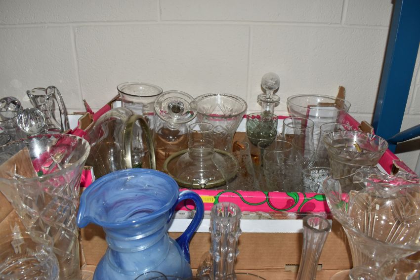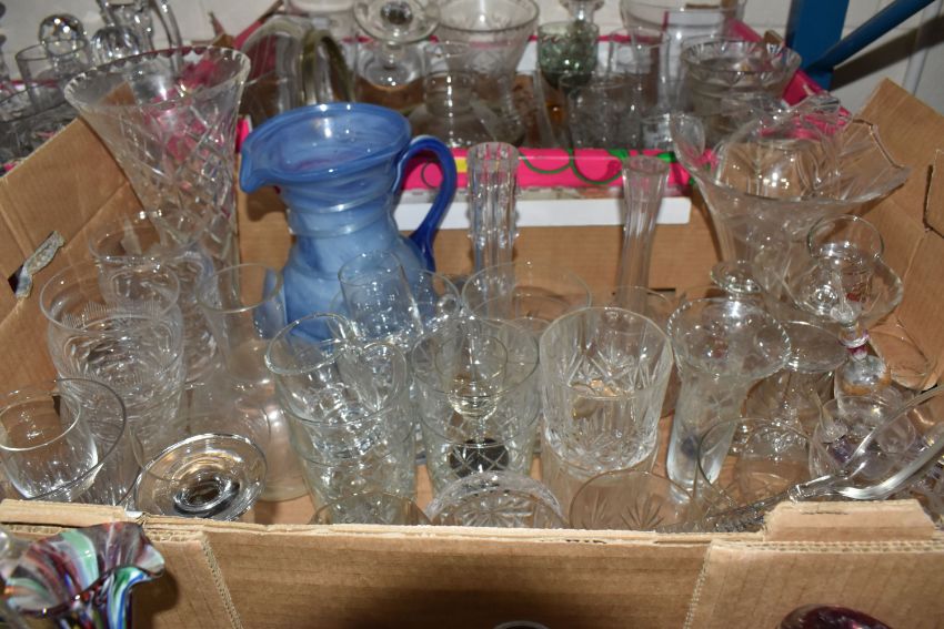 SIX BOXES OF GLASSWARE, to include a small Millefiori glass jug, a set of 1970's cocktail glasses, three Royal Doulton air twist handled bells, Killarney Crystal wine glasses, champagne flutes, whisky tumblers, decanters, jugs, fruit bowls, etc. (s.d/a.f) (6 boxes)