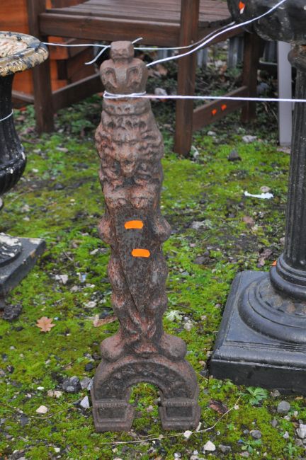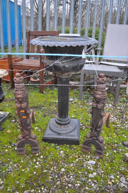 AN EARLY 20th CENTURY CAST IRON URN ON COLUMNED STAND, height 82cm, along with a pair of cast iron fire dogs with lion figures on fronts (3)