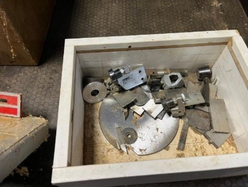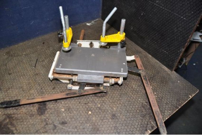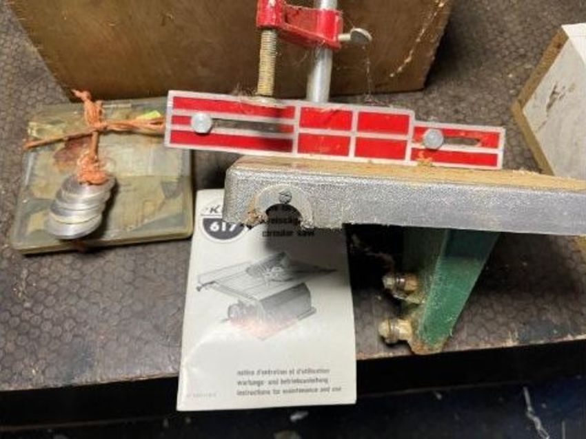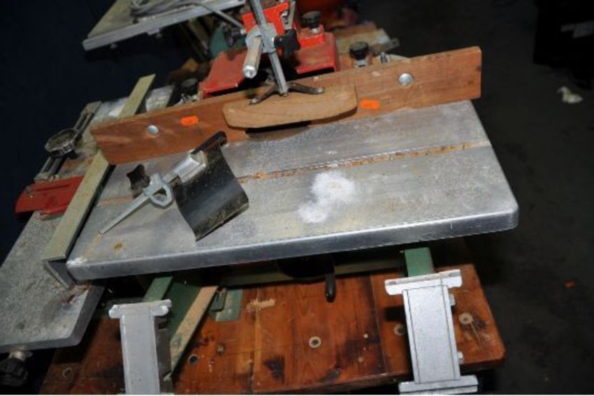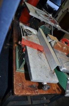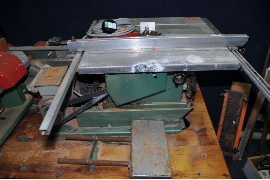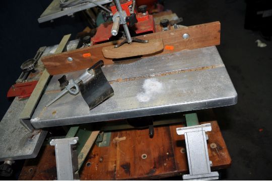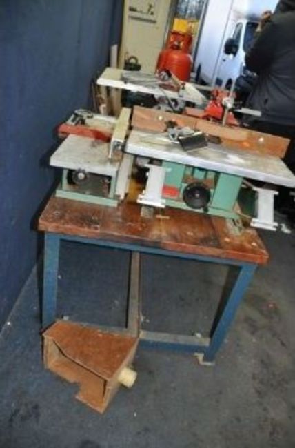 A VINTAGE KITY MULTI TOOL SYSTEM, including a 617 table saw, a 627 spindle moulder, a 535 planer jointer, a morticing attachment with motor, a bespoke angle iron frame with pine top and two belts (one missing) (PAT pass and working) (6)