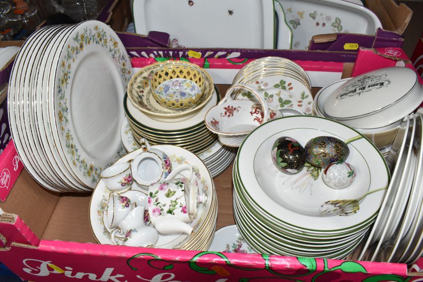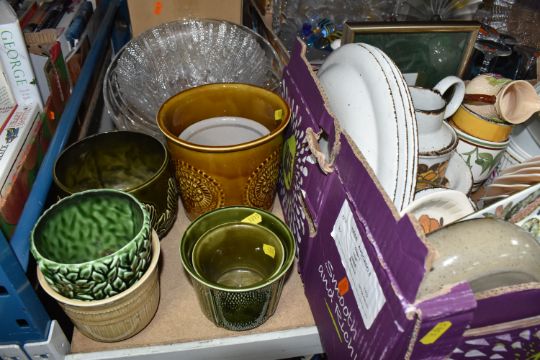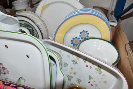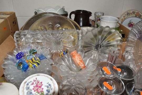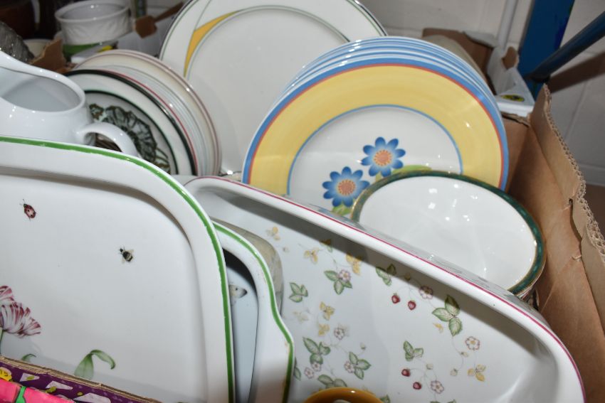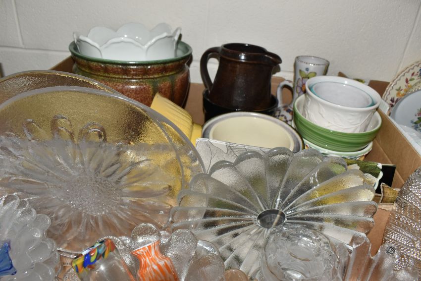 SIX BOXES AND LOOSE MISECELLANEOUS CERMAICS AND GLASS, to include a Villeroy & Boch hanging ornament of a teapot boxed, dinner plates, side plates and bowls, designs include 'Flora' and 'Twist Dora', a selection of Midwinter plates, bowls, jugs etc, designs include 'wild oats', 'green leaves', 'summer' etc. Royal Doulton dinner plates, side plates etc. Wedgwood plates and bowl, Royal Worcester soufflé dishes and ramakin pots, serving dishes and plates, Poole covered jar, Coalport covered jar, a selection of planters names include Sylvac 4536, 4211, Churchill, Arthur Wood, Denby, etc. twelve boxed champagne flutes, Dartington lead crystal tealight holders, daisy dessert bowls, large bowl, cake plates, Rosenthal plate, two covered jars, seven Murano style glass sweets and two bud vases, (one sweet has a Murano Italia makers sticker on), two large cut glass bowls (6 boxes + loose), (sd/af)