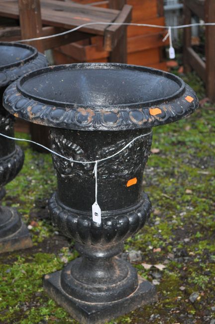 A PAIR OF EARLY 20th CENTURY CAST IRON URNS, with foliate detail and fluted bowl height 47cm (2)