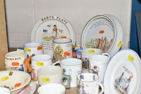 A COLLECTION OF NURSERY WARE CUPS, SAUCERS AND BOWLS ETC, to include a Tuscan China cup and saucer hand painted by Dulcie Vaughan, Kiddies in wonderland cups with handles in the form of a bird and a mouse, Royal Bramwell 'Ding ding bell' tankard, Beswick Walt Disney 'Goofy' bowl, W.H. Goss Manx cat and Rooster cup, a hand painted trinket dish initialled TG to the underside (Thomas Goode?), Falcon Playtime feeding dish with Australian motifs, Grimwades 'Baby's Plate', Foley 'Babes in the wood' feeding plate etc