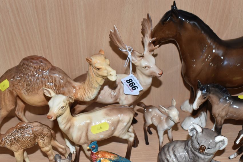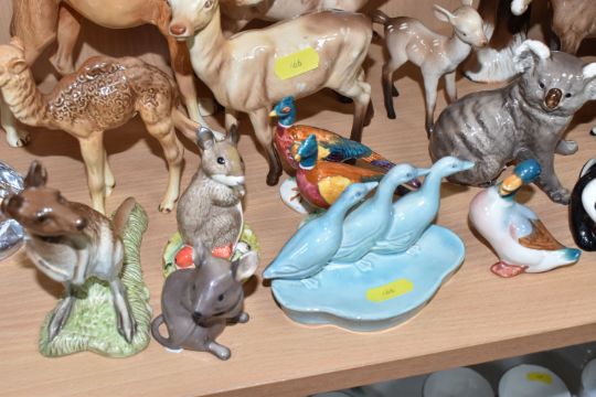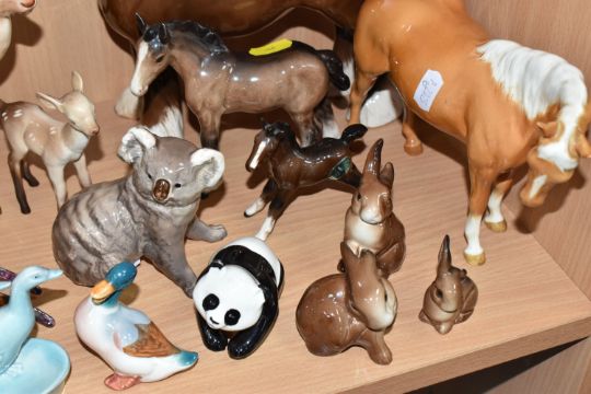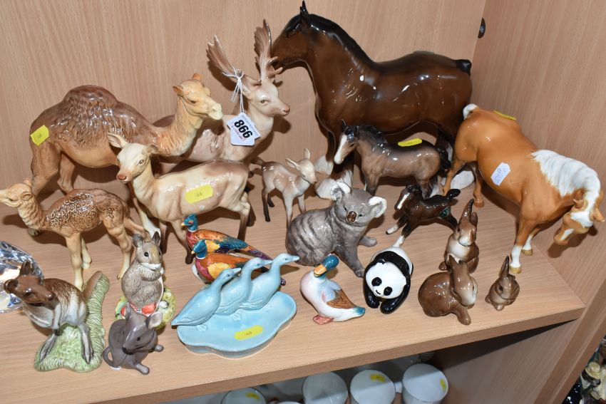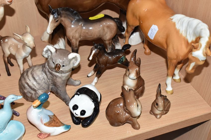A GROUP OF TWENTY-TWO BESWICK ANIMAL comprising 'Palomino Mare Facing Right' No. 1991, a 'brown Shire Mare' No. 818, a 'brown small Foal stretched facing left' No. 997, a 'small Shire Foal' No. 1053 (slight chip to the ear), a 'Koala Bear' No. 1038, a 'Camel Foal' No 1043, a 'brown Camel' No. 1044, a 'Panda cub' No.1815, a Kangaroo No. 2312, a 'Rabbit on Haunches' No. 823, a 'Rabbit Scratching Ear' No. 824, a 'Rabbit Seated' No. 826, two 'Pheasent curved tail' No. 767A, a 'trio of teal ducks' ashtray, a 'Woodmouse' No. 3399, a mouse No. 1678, a Stag No. 981, a does No. 999A, and Fawn No.1000B (22) (Condition Report: overall fair condition)