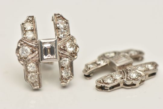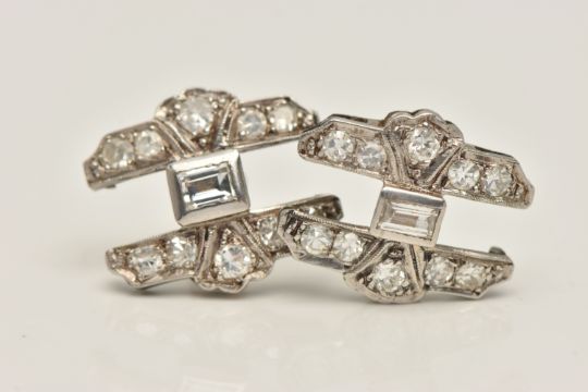 A PAIR OF WHITE METAL DIAMOND SET EARRINGS, converted earrings from possible links, each set with a central rectangular diamond, approximately 0.10ct each, in surrounds of two round brilliant cut and four single cut diamonds, approximately 0.28cts, total estimated diamond weight 0.76cts, one earring fitted with a post and scroll back, the other missing post and scroll, unmarked metal, approximate gross weight 4.9 grams (condition report: require attention)