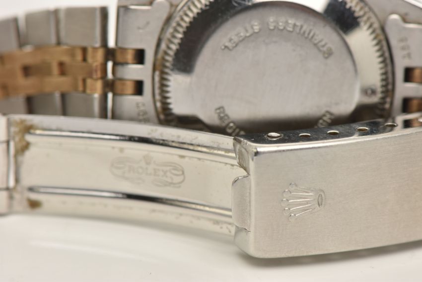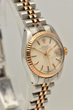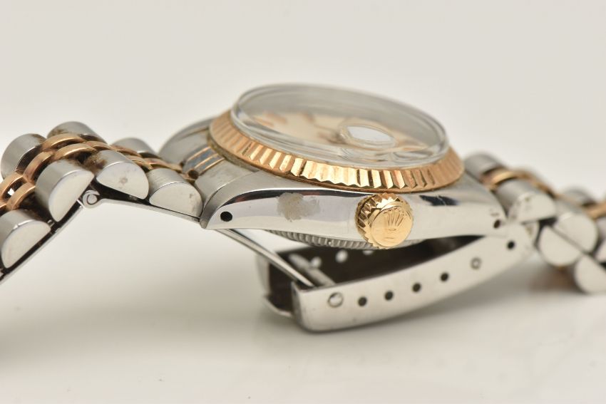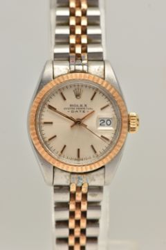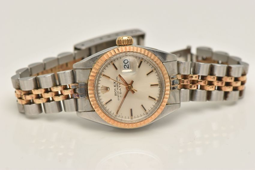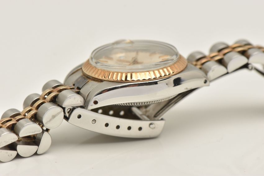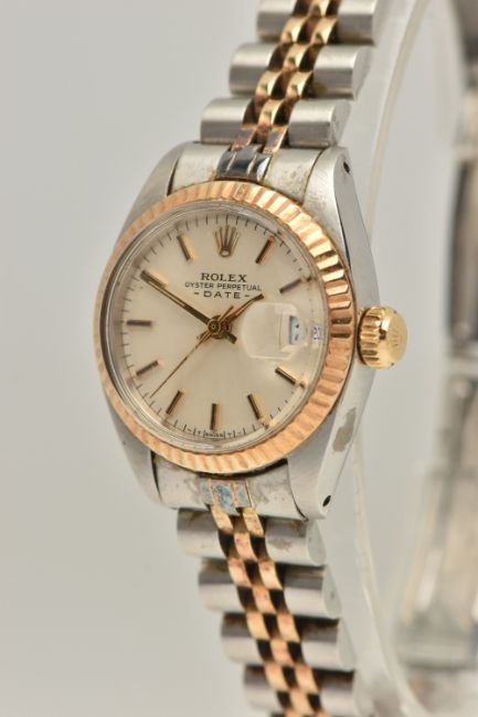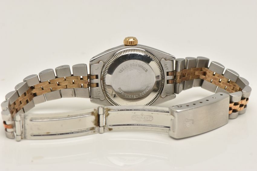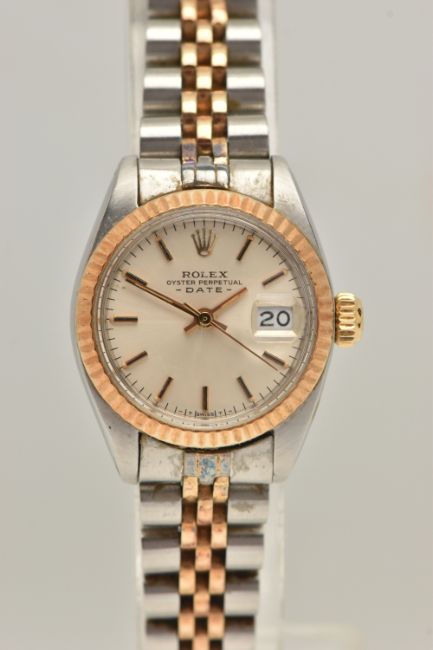 A LADIES 'ROLEX' WRISTWATCH, automatic movement, champagne dial signed 'Rolex Oyster Perpetual Date', baton markers, date aperture at the three o'clock position, Rolex logo at the twelve o'clock position, yellow gold fluted bezel, stainless steel case, approximate case width 25mm, fitted with a bi colour Jubilee bracelet, and folding clasp, clasp signed 'Rolex' numbered 62523-D14, bracelet number 468, calibre 2030, case back 6900 (condition report: general moderate wear, watch is currently running, time keeping has not been tested, bracelet and case back have not been removed, slack to bracelet, no box or papers with watch, we cannot guarantee the working order of any watch)
