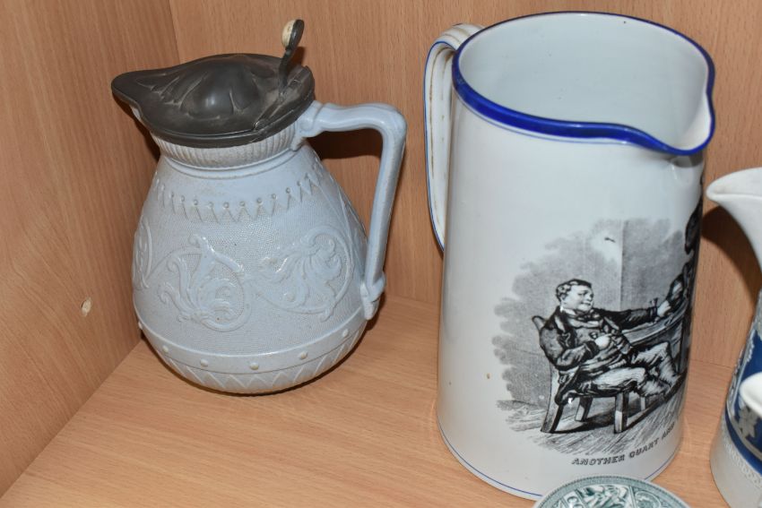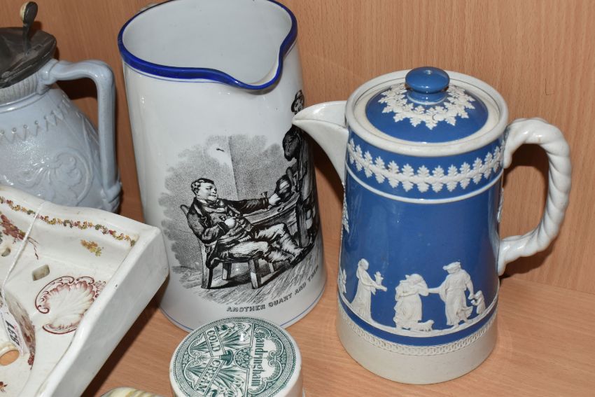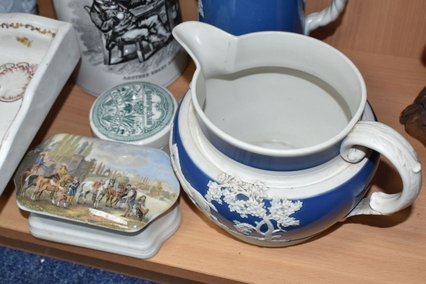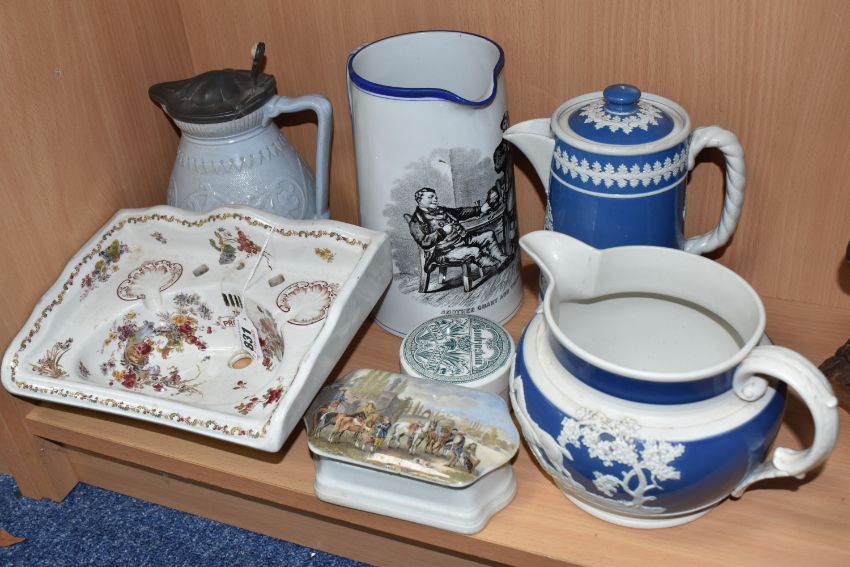 A GROUP OF SEVEN MIXED NINETEENTH CENTURY MISCELLAENOUS CERAMICS to include a miniature salesman's sample sink with a printed pattern and marked 'The Improved Progress' height 11cm width 24cm (hairline cracks), a Sandringham Cold Cream pot (chips to the rims), a Corbridge pewter lidded jug a Copeland ale jug with a printed image to the front (hairline crack to the base), and two Wedgwood style jugs of varying form (some cracks to the white patterns), etc (7) (Condition Report: itemised conditions above)conditions above