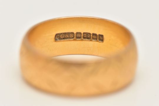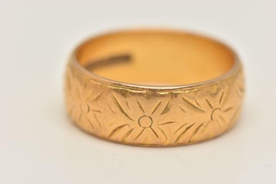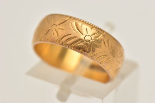 A 22CT GOLD BAND RING, floral patterned band ring, approximate width 6mm, hallmarked 22ct Birmingham, ring size K 1/2, approximate gross weight 6.1 grams, (condition report: general moderate wear, some wear to pattern)