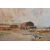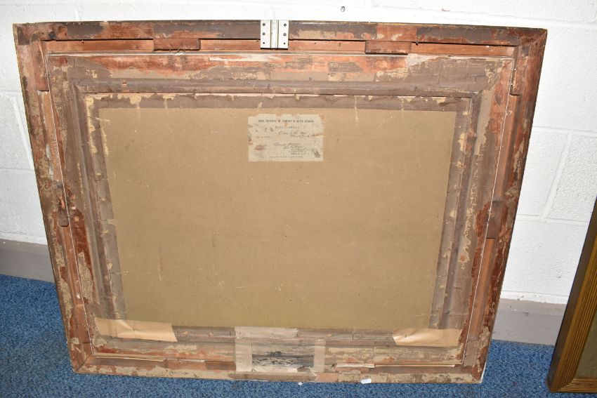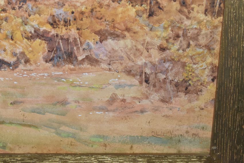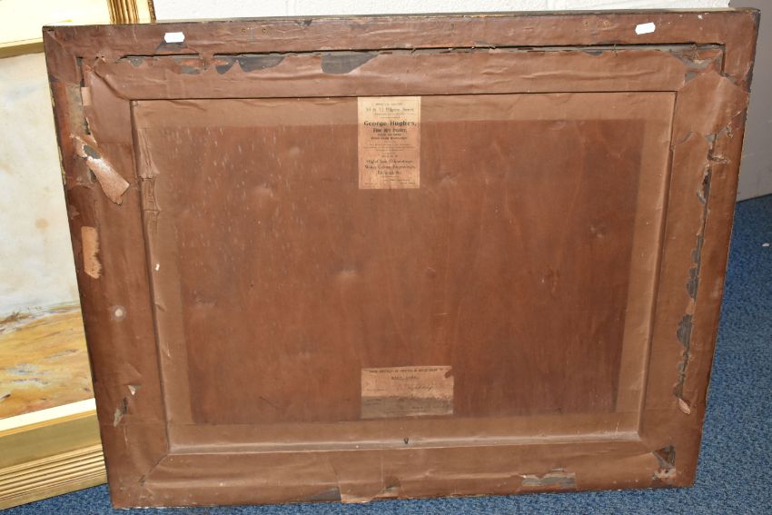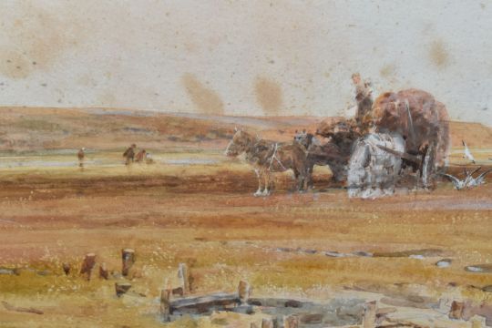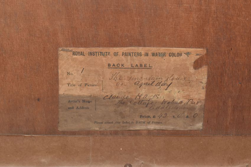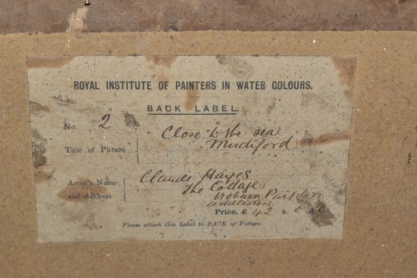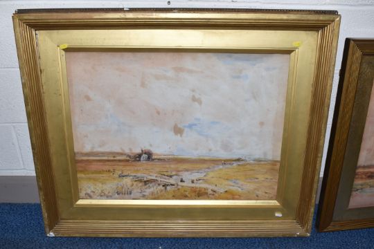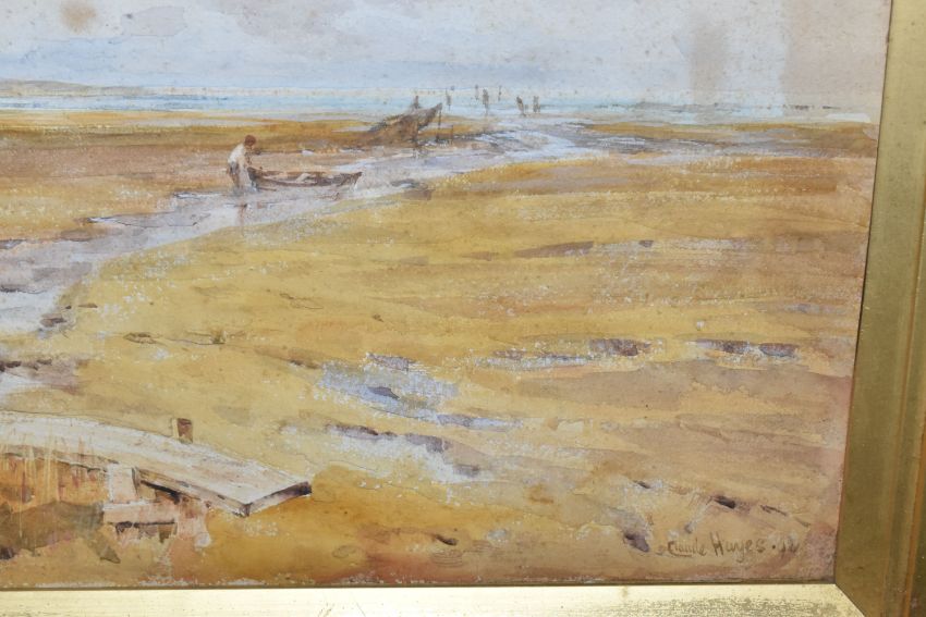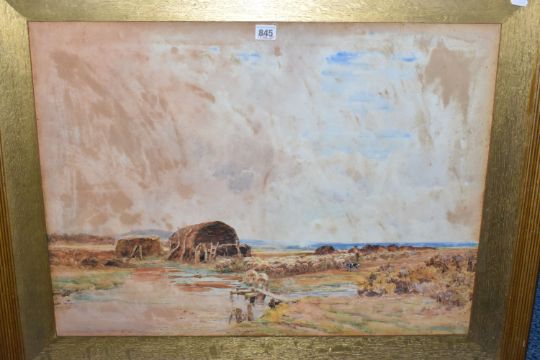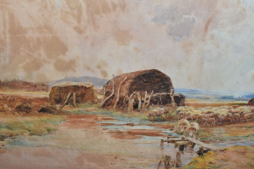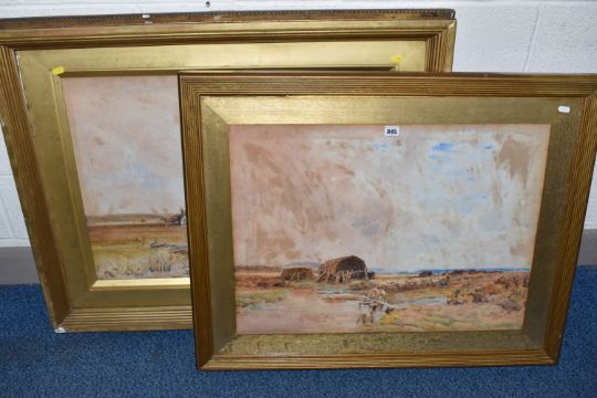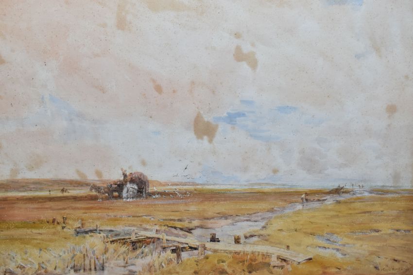 CLAUDE HAYES (1857-1922) 'CLOSE TO THE SEA, MUDEFORD', a coastal harvesting scene, signed and dated (18)92 bottom right, signed and titled to label verso, watercolour on paper, approximate size 54cm x 74cm, together with 'An Uncertain Flock, an Aprils Day', a shepherd herding his flock across a narrow wooden bridge, a watercolour by the same hand, signed and dated (18) 92 bottom right, signed and titled verso with George Hughes label verso, approximate size 53cm x 72cm, Condition Report: both pictures have discolouration and foxing, first picture has losses to the frame and is loose in the frame, both frames have rubs to the painted finish