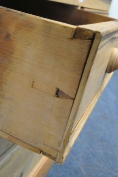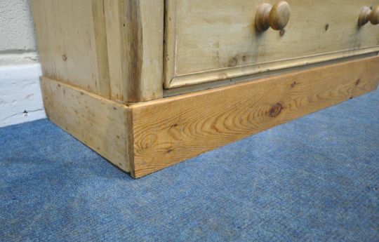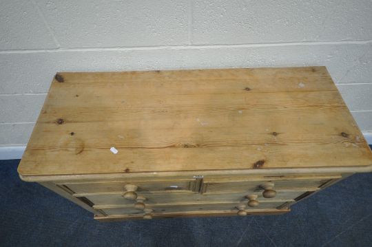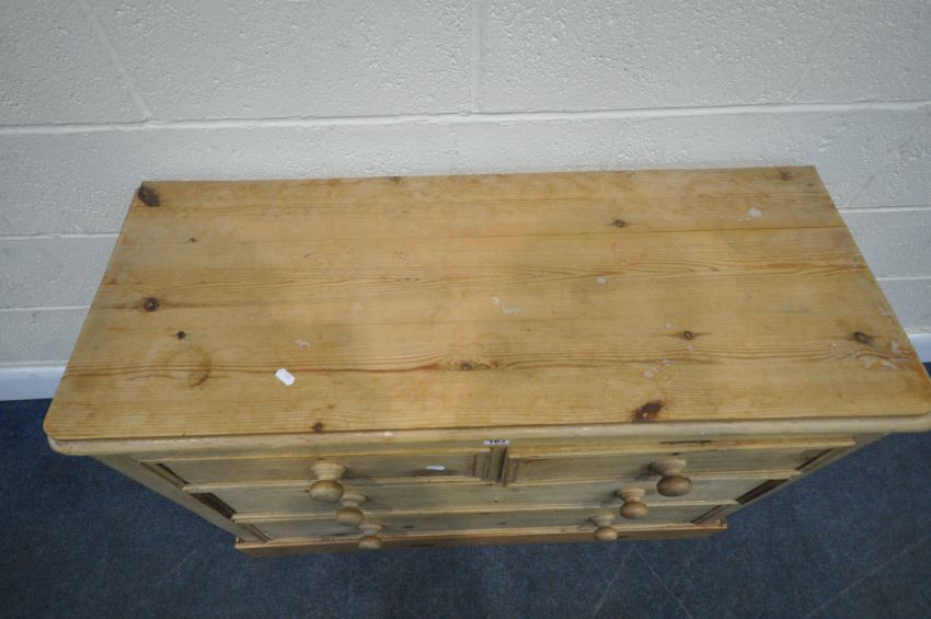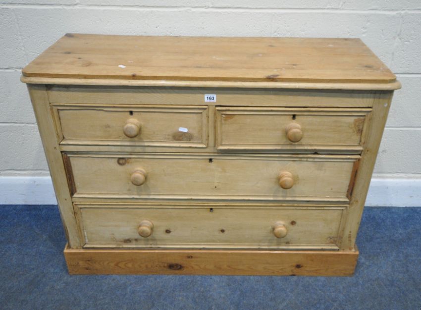 A 19TH CENTURY PINE CHEST OF TWO SHORT OVER TWO LONG DRAWERS, width 106cm x depth 46cm x height 77cm, condition report: historical marks, scuffs, stains, splits, later timbers to the bottom and beading, other wear and usage