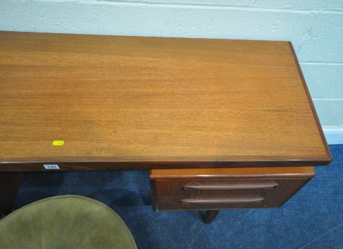 G PLAN, A MID CENTURY FRESCO TEAK DRESSING TABLE, fitted with four drawers, raised on tapered legs, with a loose rectangular mirror, and a circular stool, condition report: no mirror uprights, marks, scuffs, discolouration, stool with no fire regulation label, other signs of usage