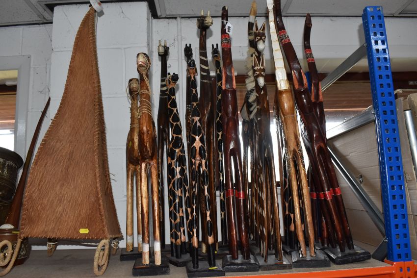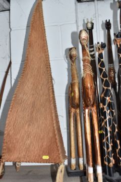 AN ABSTRACT LAMP AND WOODEN FIGURES, included an animal skin look lamp in an irregular triangle shape with wicker bound curved feet, tall wooden animals to include giraffes, camels, elephants, horses, etc. height of tallest 100cm, (qty), (Condition Report: lamp not tested, ripped and sewn one side, stitching damaged in places, the wooden figures appear ok but may have sd)