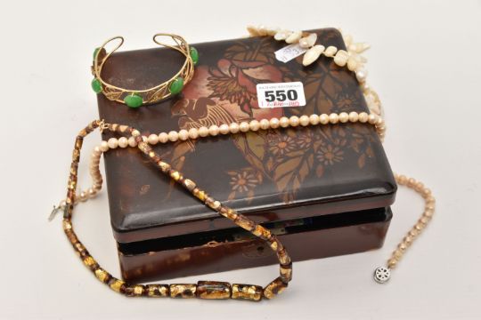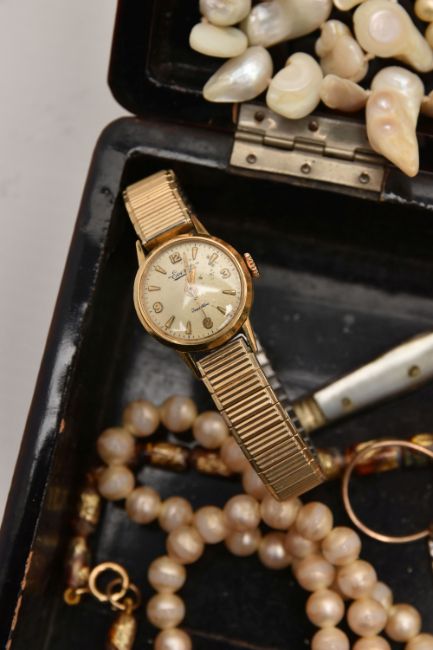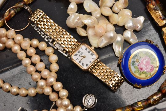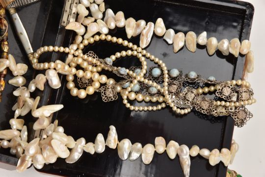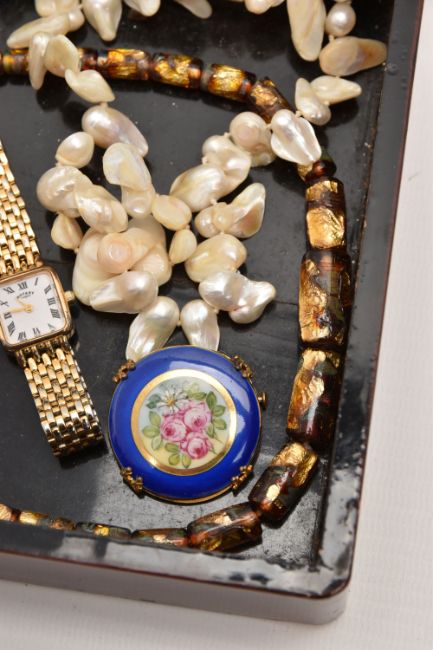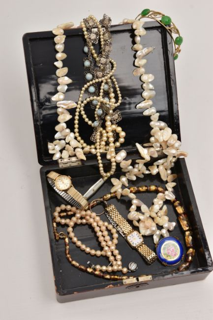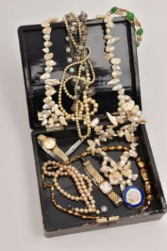 A BOX OF ASSORTED COSTUME JEWELLLERY, to include a long strand of baroque cultured pearls, imitation pearl necklace, a ladies gold plated 'Everite' wristwatch, a ladies 'Rotary' wristwatch, mother of pearl handled fruit knife etc