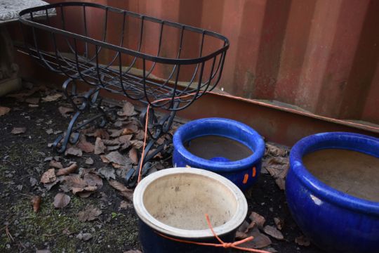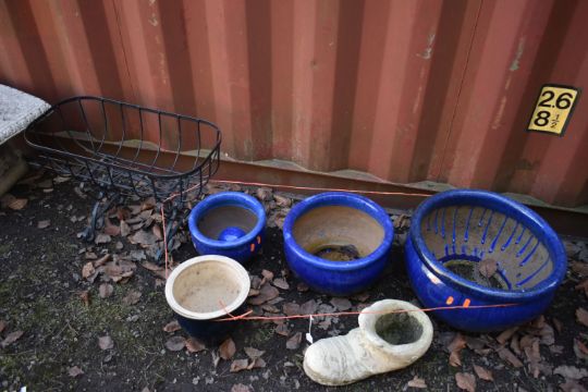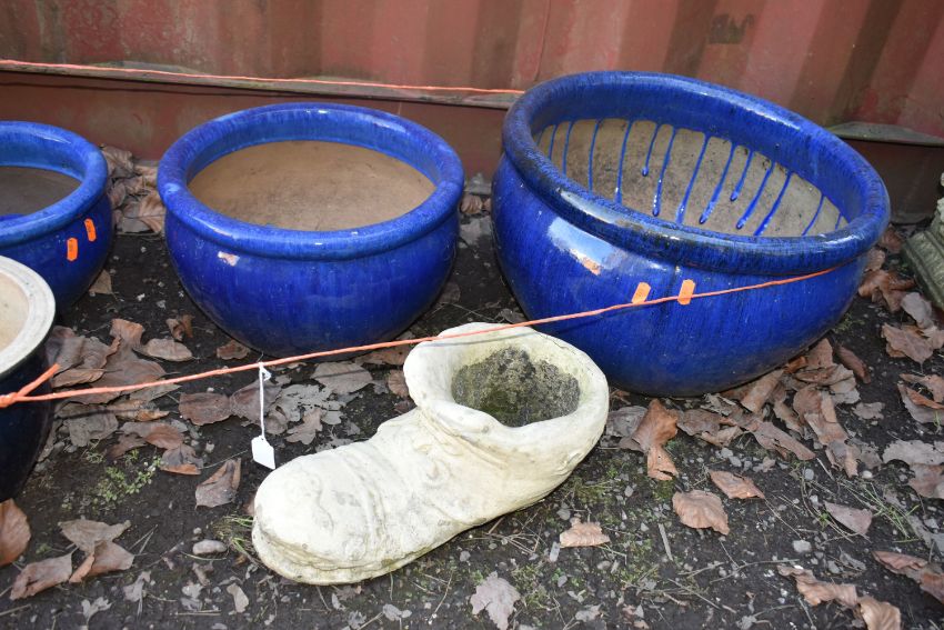 A SET OF THREE GRADUATING GLAZED PLANTERS, diameter 44cm x height 27cm, another glazed plant pot, a shoe shaped garden items and a wire planter (6)