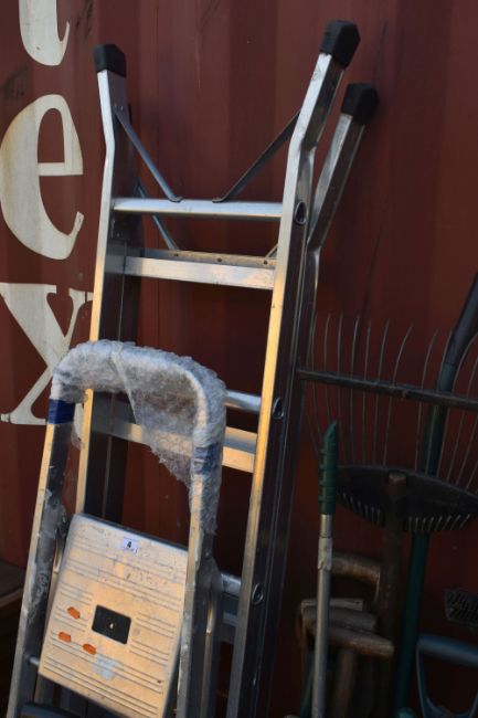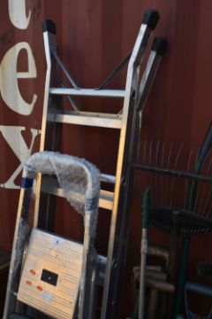 A SELECTION OF GARDEN ITEMS, to include three bundles of spades, rakes, shovels, etc, along with an aluminium step ladder and a folding sack truck