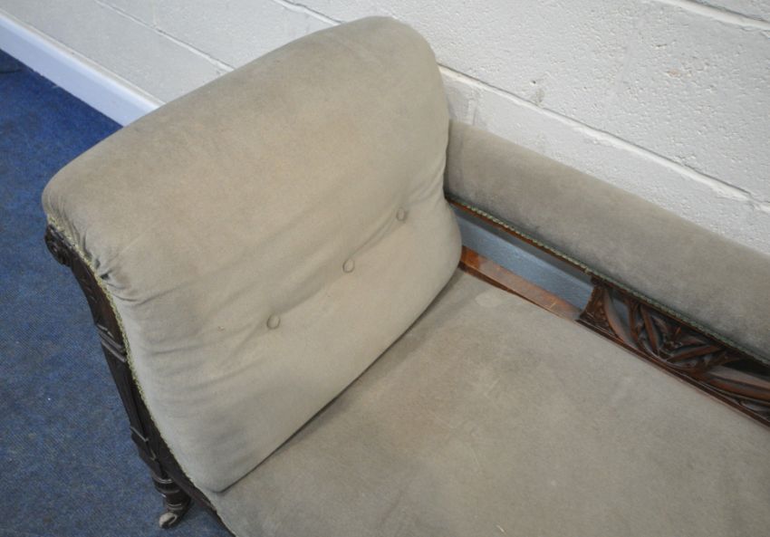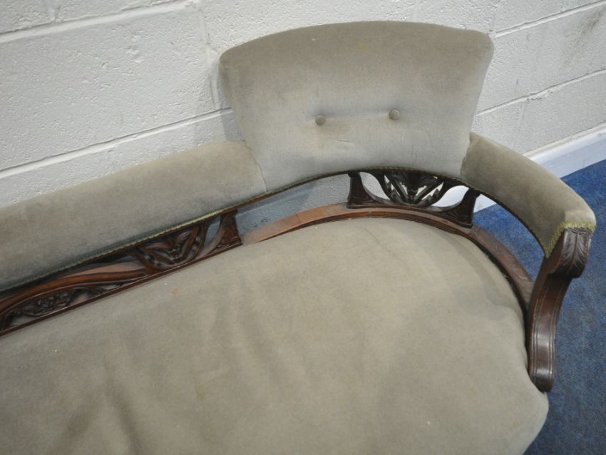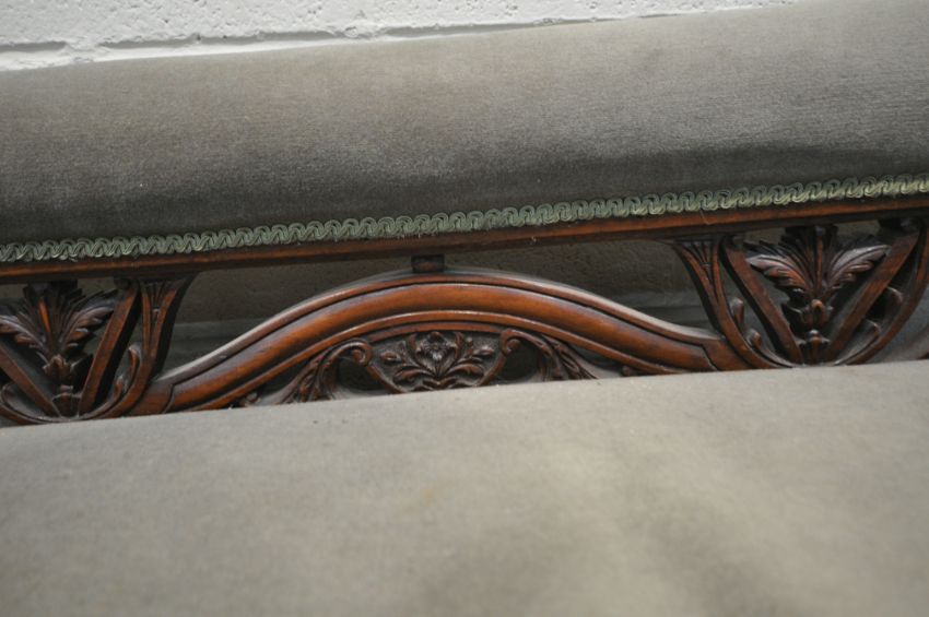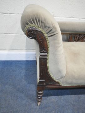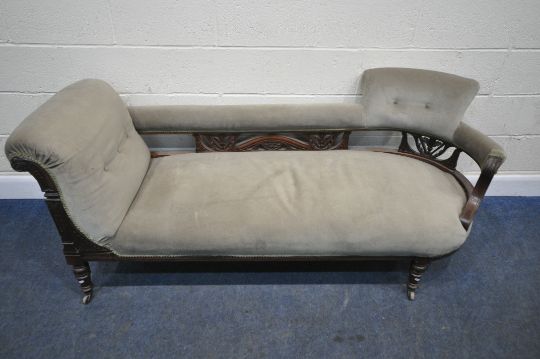 AN EDWARDIAN MAHOGANY FRAMED SOFA, one end scrolled, the other mimicking a chair, scrolled and foliate details, raised on turned and tapered legs, length 183cm x depth 75cm x height 77cm x height to seat 42cm, condition report: missing one castor, historical marks, scuffs, discolouration, other wear and usage