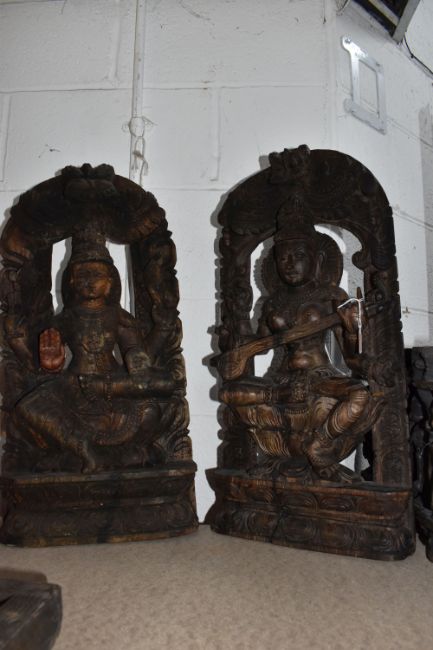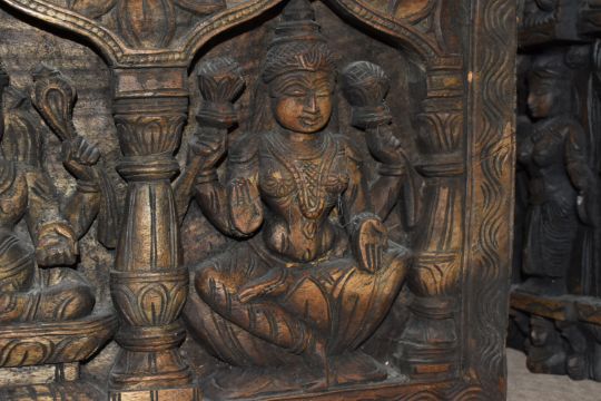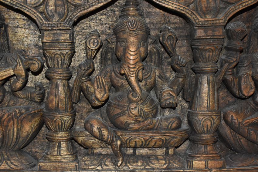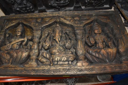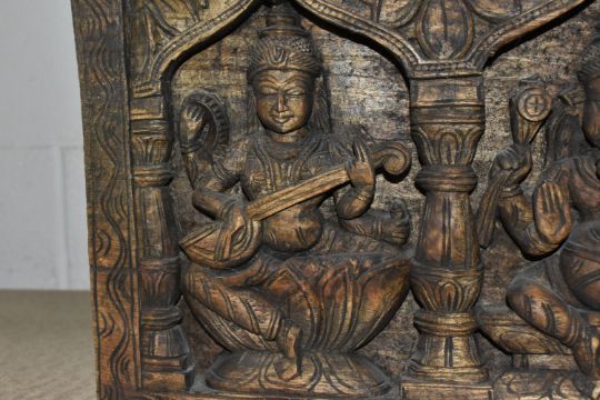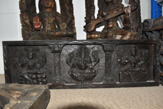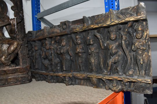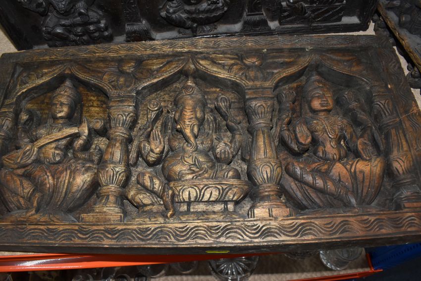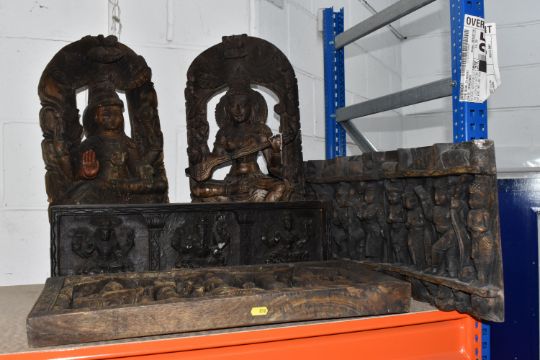 FIVE CARVED WOODEN PANELS, depicting Hindu deities, largest measures approximately 89cm x 29cm (5) (Condition Report: generally appear ok, some cracks, losses and wear)