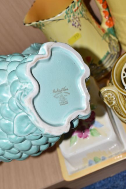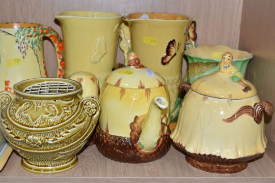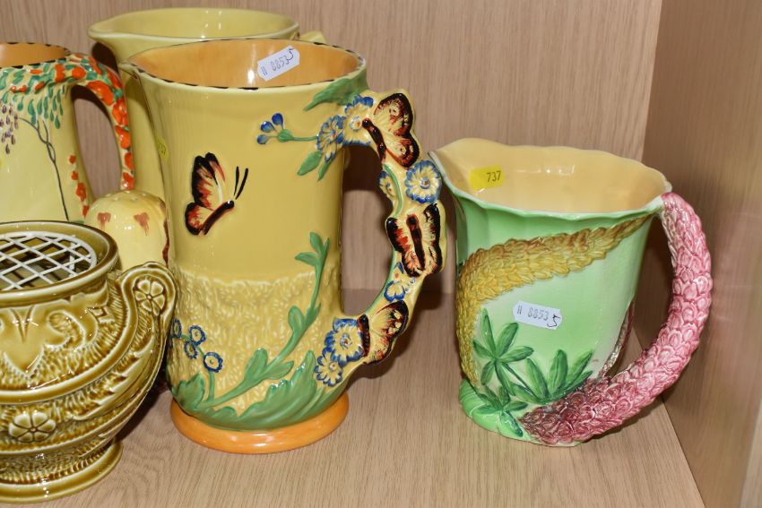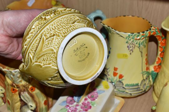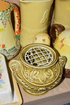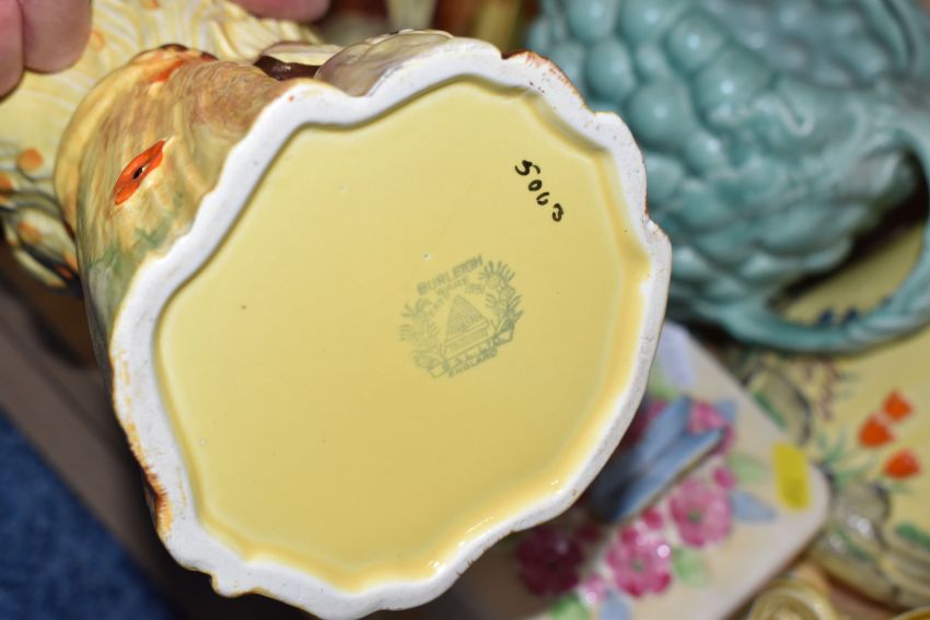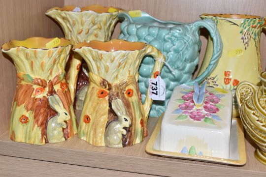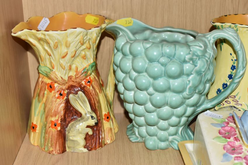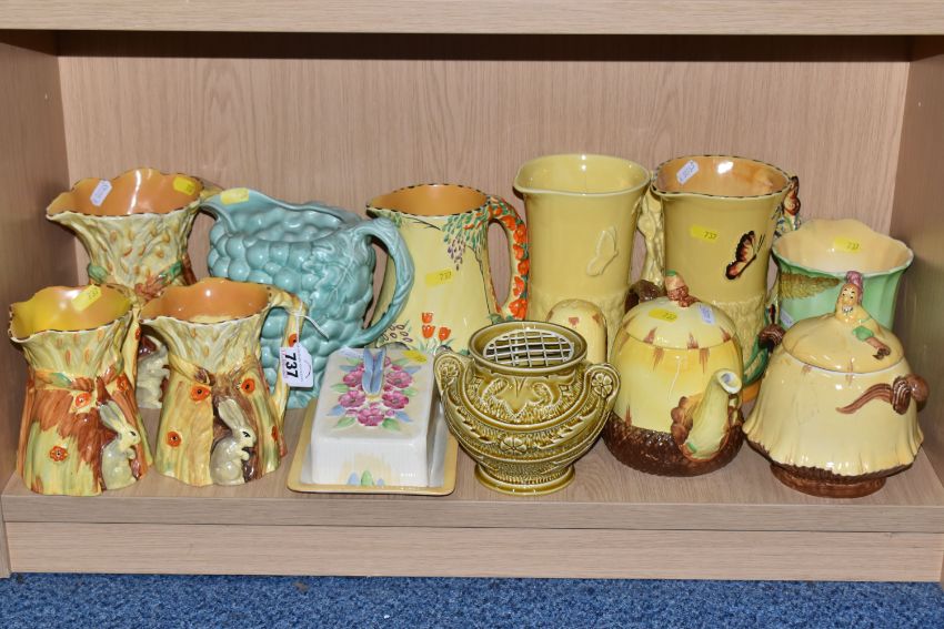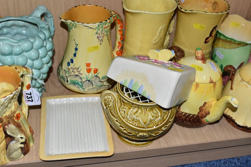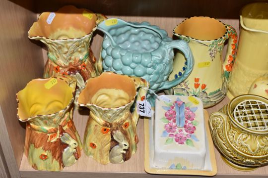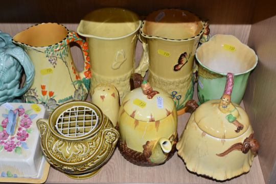 A COLLECTION OF BURLEIGH WARE CERAMICS to include three jugs with moulded rabbits, an acorn teapot and shaker, a butterfly butter dish, two butterfly water jugs in differing colourways, a lidded pot with a dwarf finial, a grape shaped water jug, a moulded rose bowl, etc (qty) (Condition Report: most appear in good conditions, some light crazing in places)