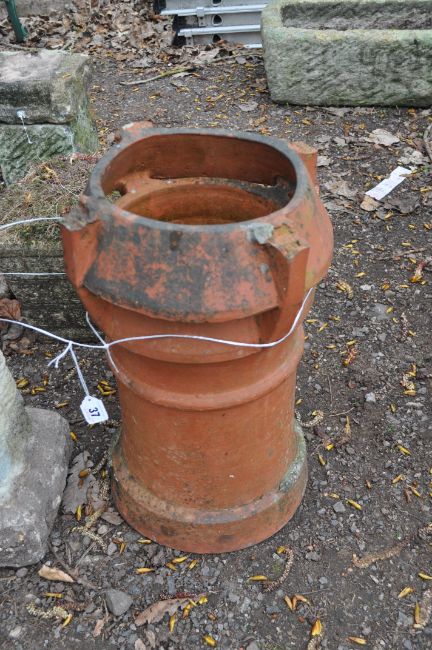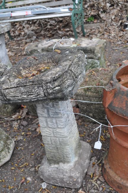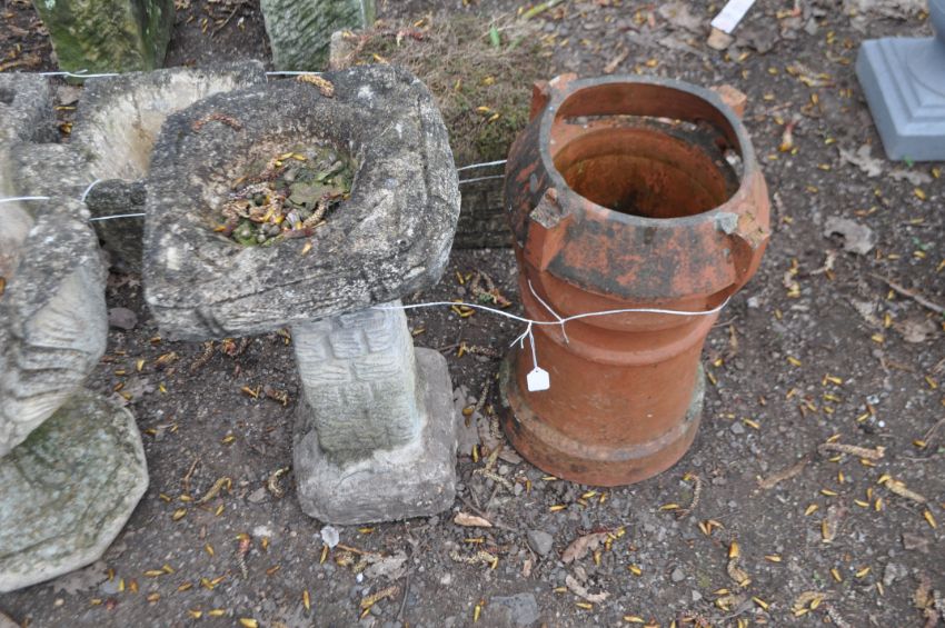 A MODERN CONCRETE BIRD BATH, In the form of a brickwork column, along with a terracotta chimney pot (2)