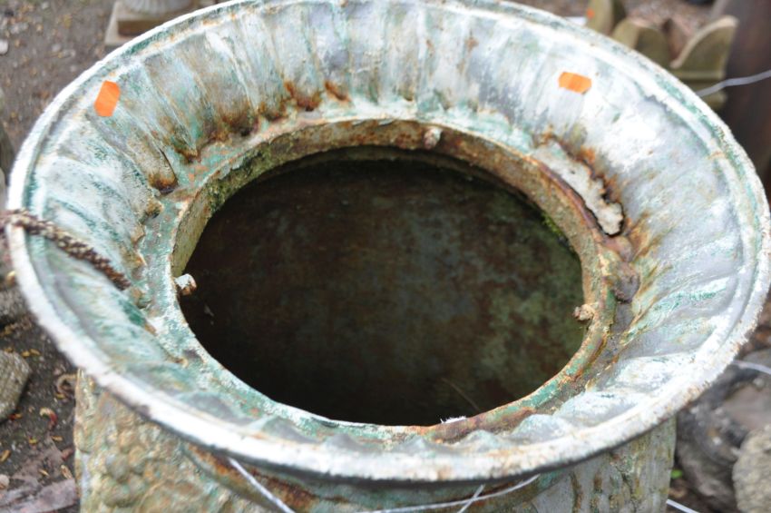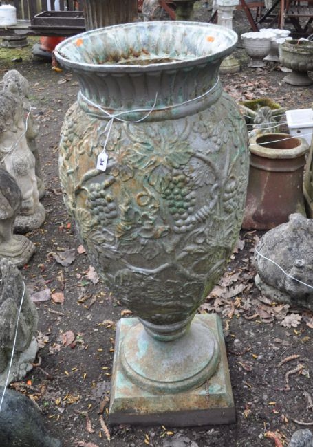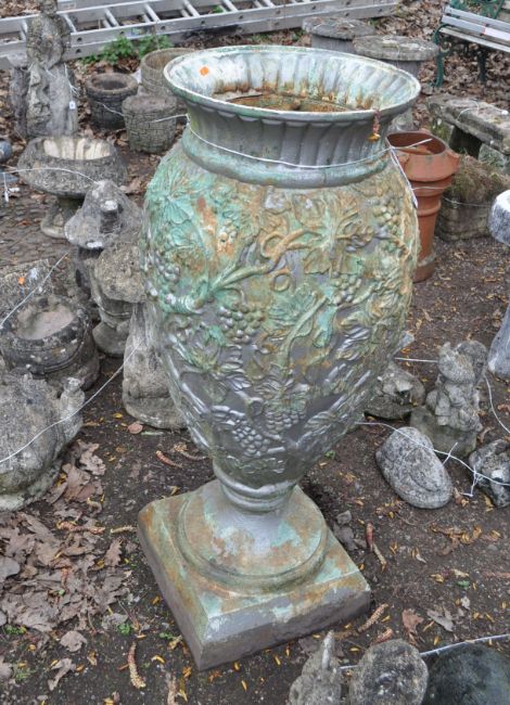 A LARGE CAST IRON URN, with grape and vine detailing, height 110cm