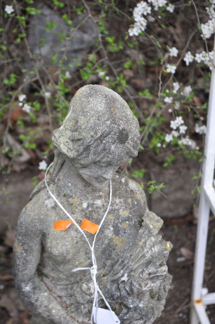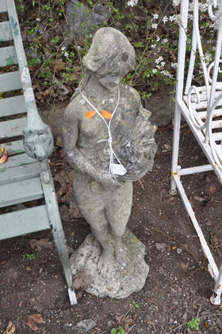 A MID CENTURY RECONSTITUTED STONE GARDEN FIGURE, in the form of a scantily clad flower girl, height 83cm. Condition Report: no apparent losses or damage