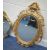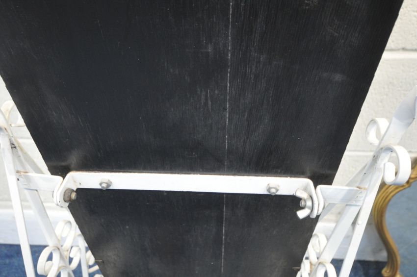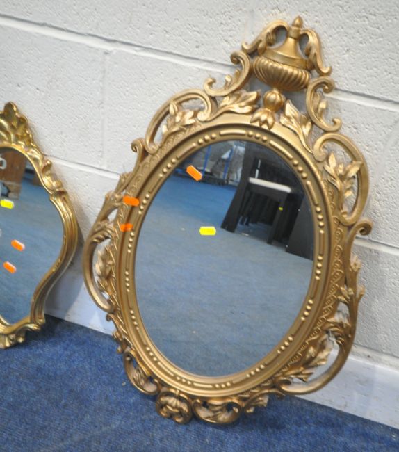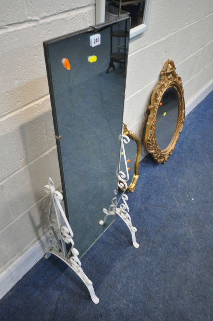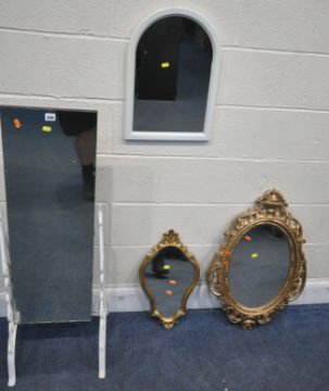 A WHITE PAINTED WROUGHT IRON FLOOR STANDING MIRROR, height 110cm, a gold plastic wall mirror, gilt resin mirror, and another mirror, condition report: floor standing mirror with replacement bolts, all with general signs of usage (4)