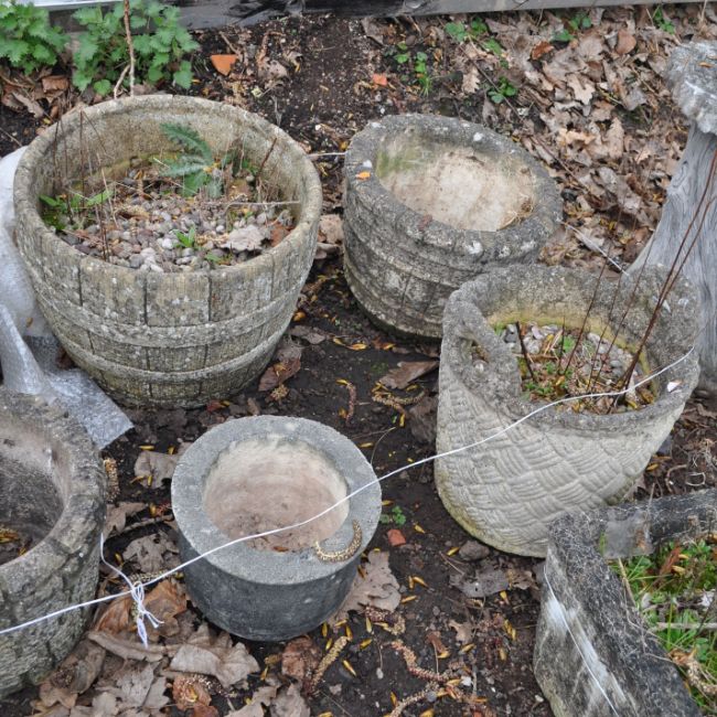 A COLLECTION OF SIX MODERN CONCRETE GARDEN PLANTERS, including a pair of round brickwork effect 30cm in diameter, two barrel effect, a wicket basket effect pot etc (6)