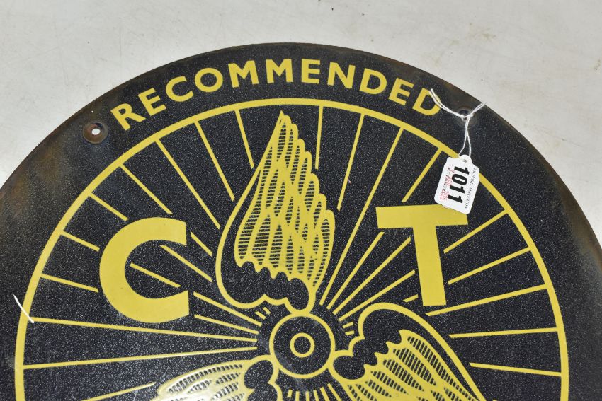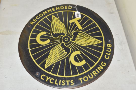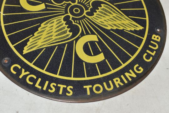 AN EARLY 20TH CENTURY ADVERTISEMENT SIGN, of circular form, CTC- The Cyclists Touring Club was a charitable organisation supporting cyclists and promoting bicycle use, diameter 40cm (1) (Condition Report: four fixing holes, some slight rusting to outer edge, light sun fade to colour, commensurate with age, yellow lettering and logo on a blue ground)