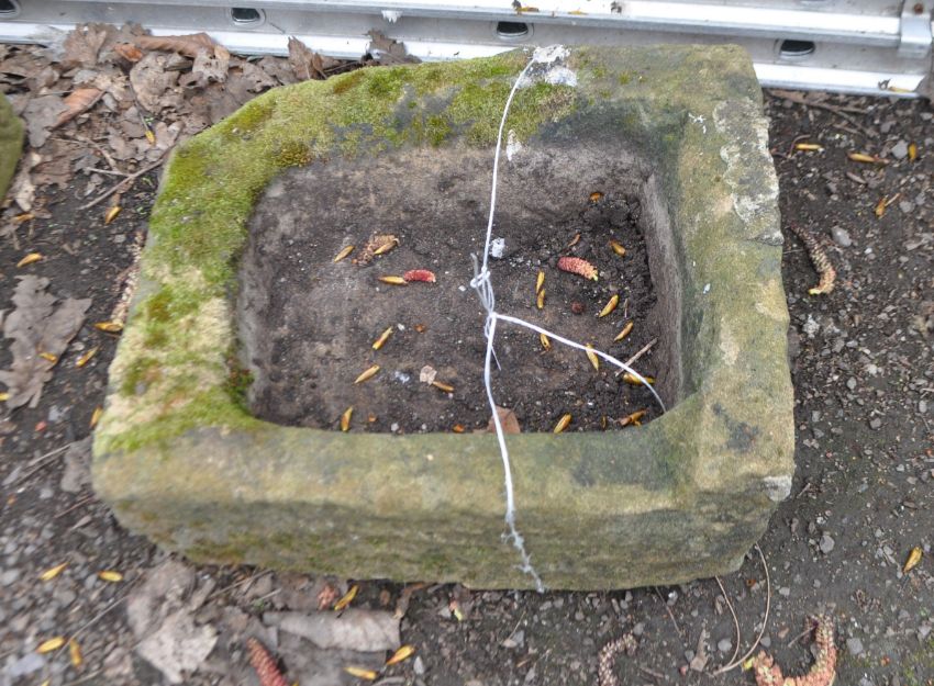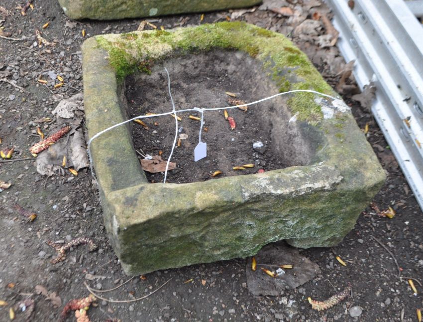 A PERIOD SANDSTONE TROUGH width 46cm, depth 38cm, height 20cm. Condition Report: dated losses