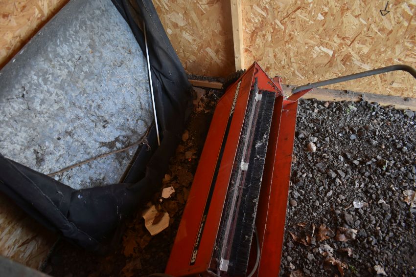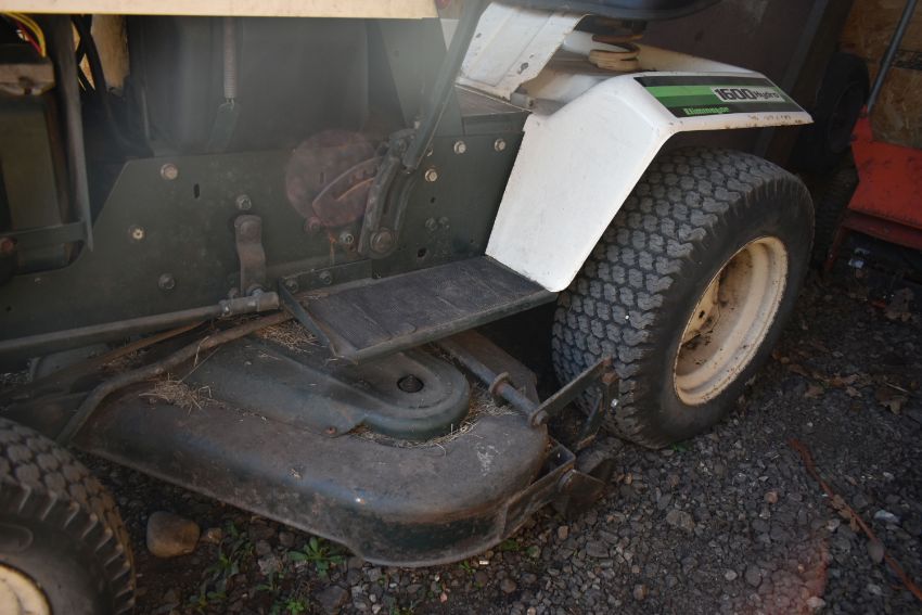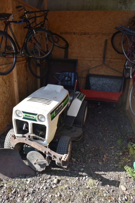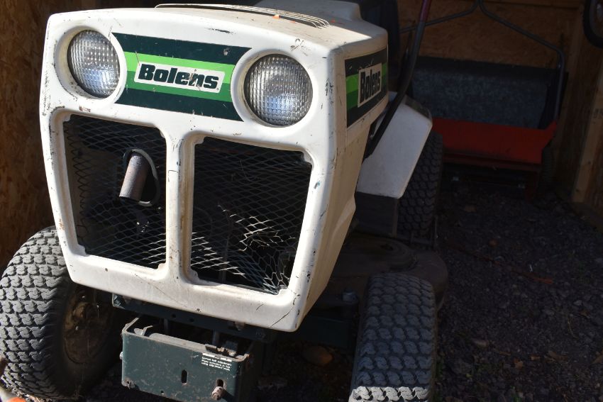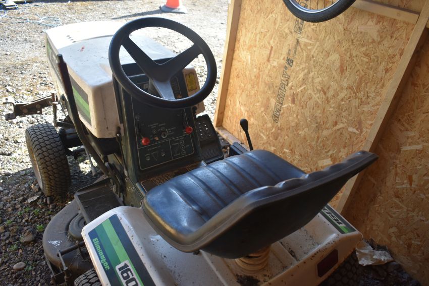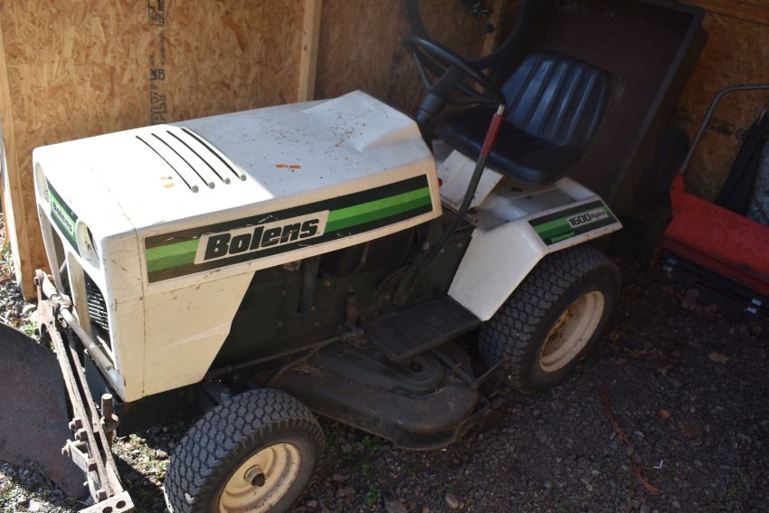 A BOLENS 1600 HYDRO ELIMINATOR RIDE ON LAWNMOWER, with an unbranded trailer, Ingersoll hi sweep 38 lawn sweeper with collector, and Brinly single bottom plow, condition report: with one key and starts first time, servicing required as cutting blade intermittent, trailer rusted and chassis partially separating from box (4)