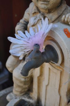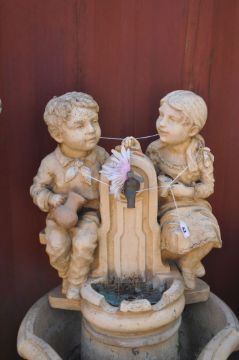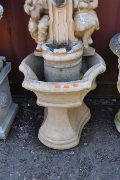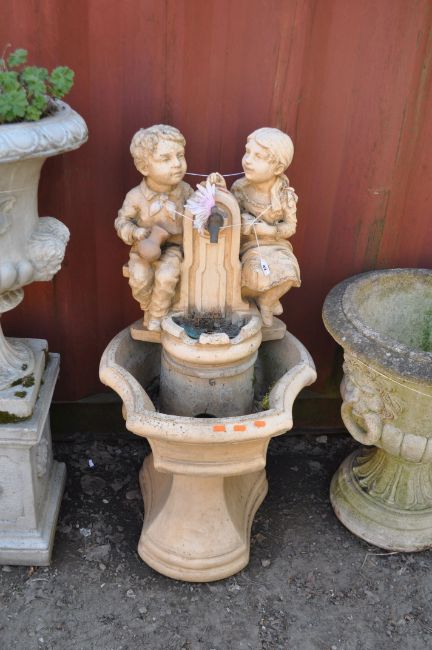 A MODERN CONCRETE GARDEN WATER FEATURE, in the form of two small children sat by a drinking fountain, cascading to a lower pool, height 102cm