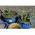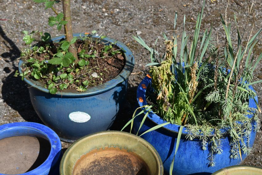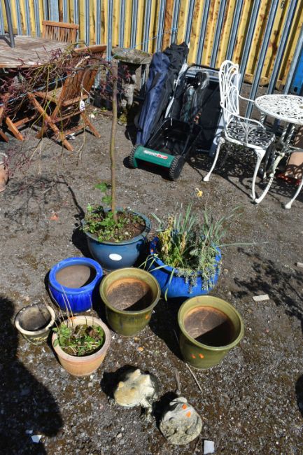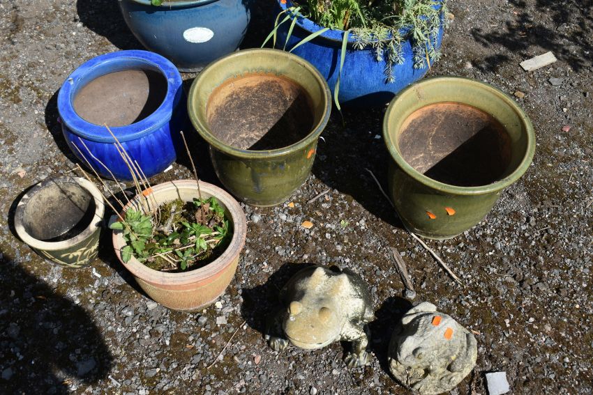 SEVEN GLAZED PLANT POTS, of various sizes and colours, one pot containing an acer tree, along with two composite garden frogs (9)