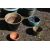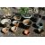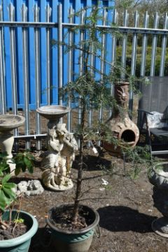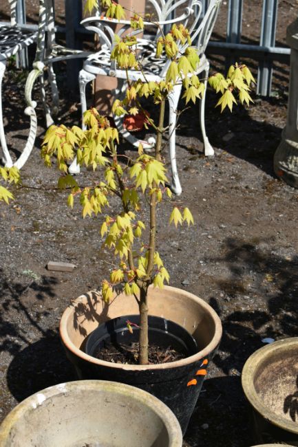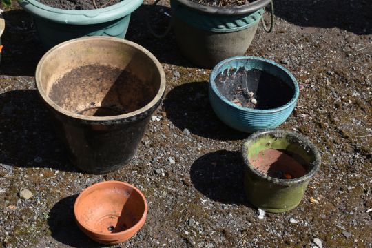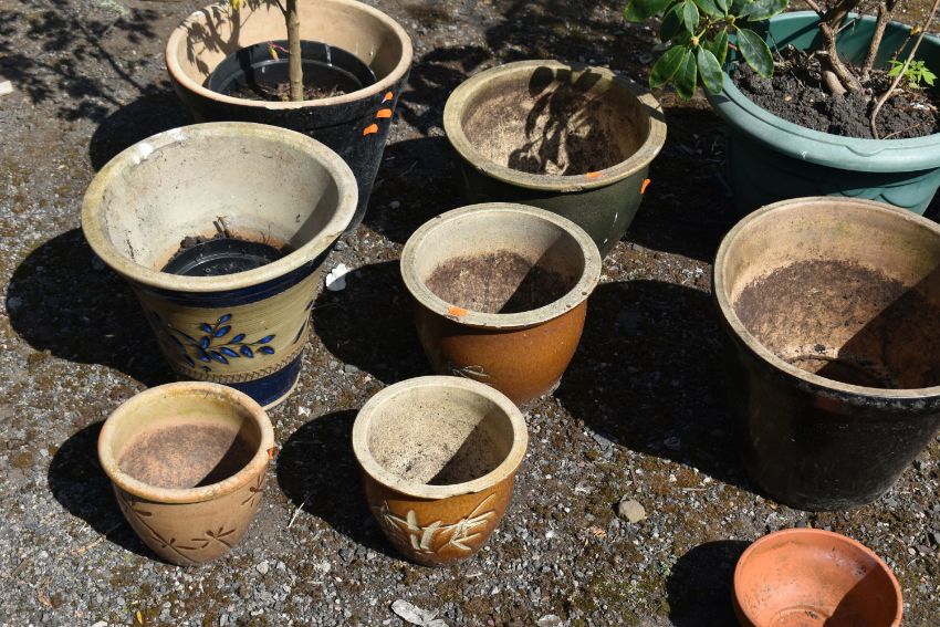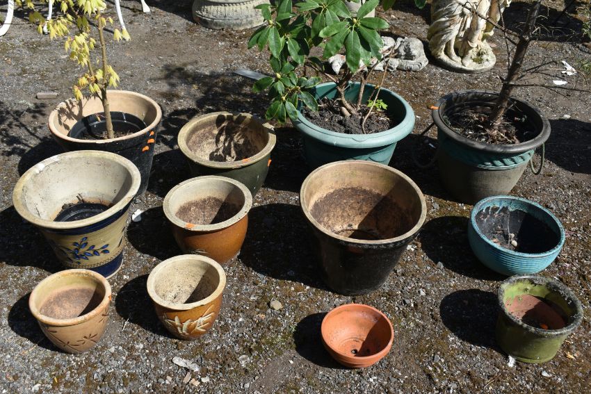 A SELECTION OF GLAZED PLANT POTS, of various sizes and colours, along with three plastic plant pots all containing plants including a green acer tree, great laurel plant and another tree (13)