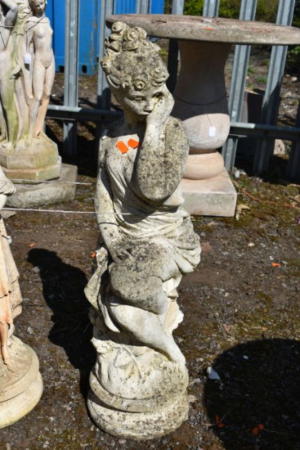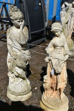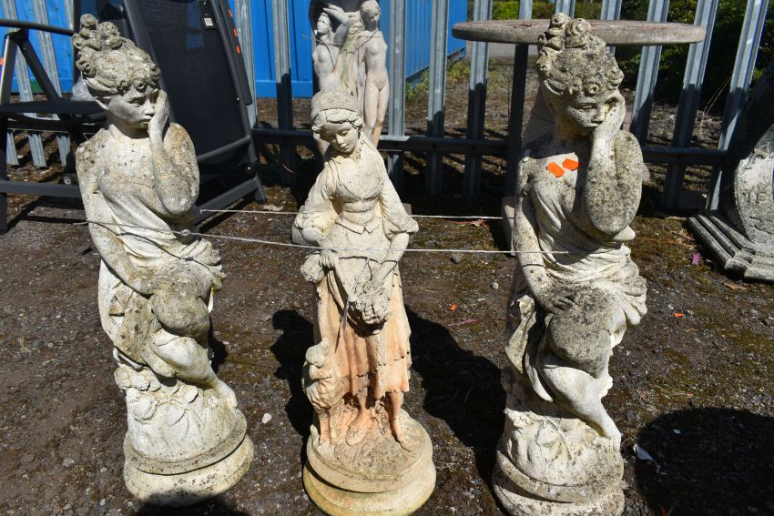 A MATCHING PAIR OF WEATHERED COMPOSITE GARDEN FIGURES, of women in flowing robes, height 69cm, and another female garden figure (3)