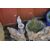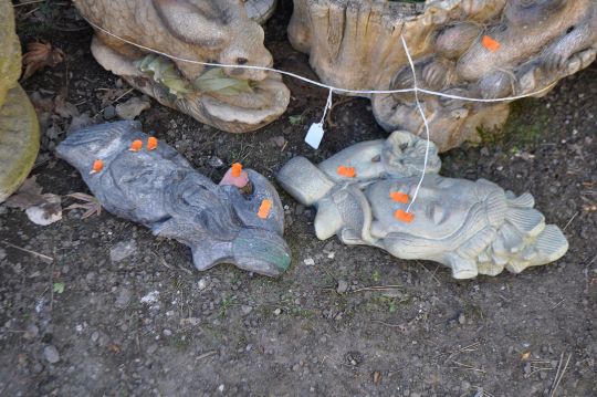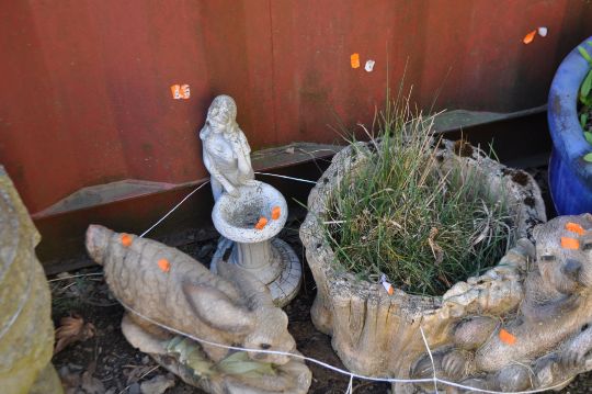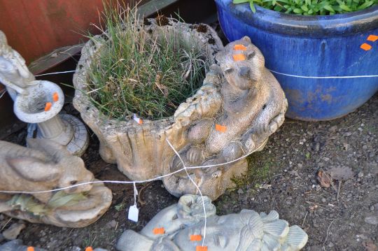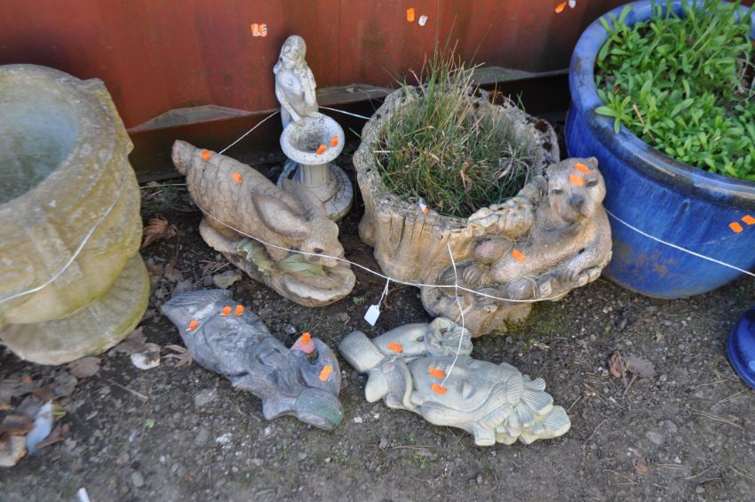 A COLLECTION OF FIVE CONCRETE GARDEN ORNAMENTS, including a planter with a beaver seated on a tree stump, two oriental style plaques, a rabbit, and a miniature water feature (5)
