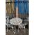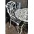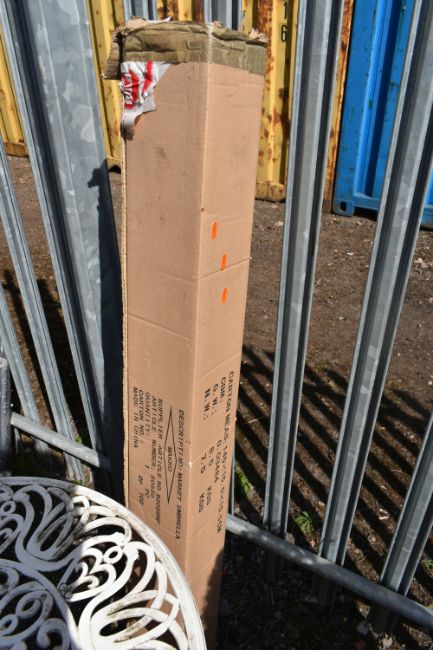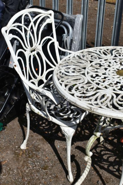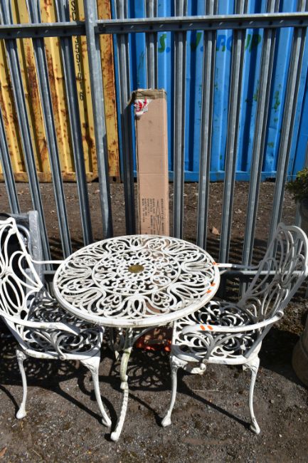 A PAINTED CAST ALUMINIUM CIRCULAR GARDEN TABLE, diameter 74cm x height 73cm, two armchairs and a boxed parasol, condition report: paint peeling, solid frame (4)