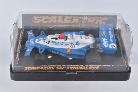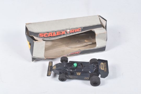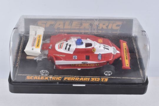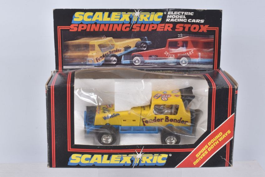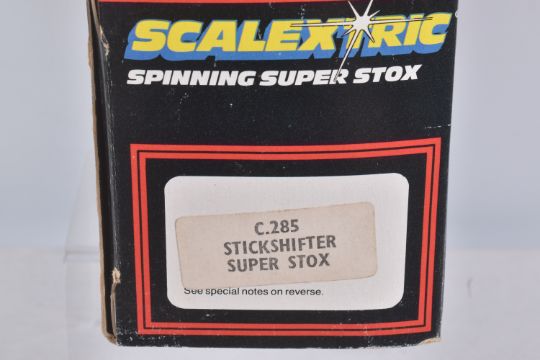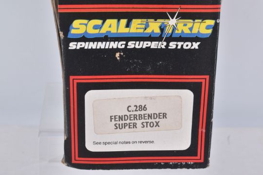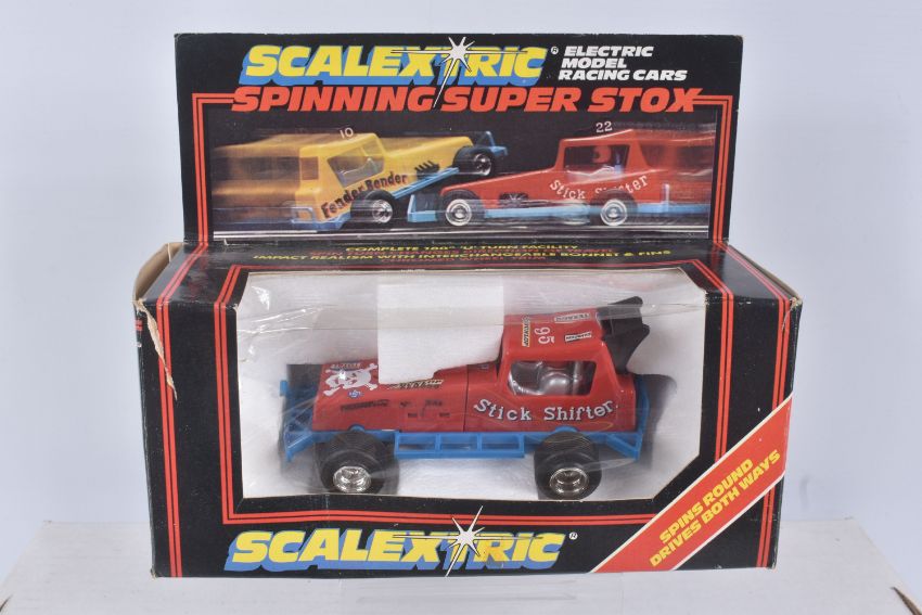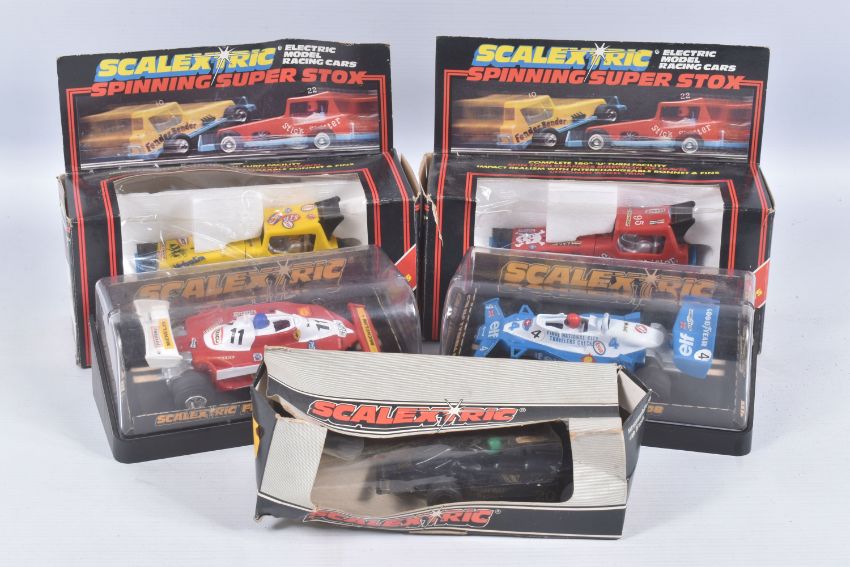 THREE BOXED SCALEXTRIC FORMULA 1 RACING CARS, Wolf WR5, No.C133, Ely Tyrrell 008, No.C135 and Ferrari 312 T3, No.C136, with two Spinning Super Stox Cars Stickshifter, No.C285 and Fenderbender, No.C286, all appear complete and in good condition, but have some minor wear, some with extra decals added, C133 box with extensive damage and wear, C135/C136 plastic boxes in good condition, Stox boxes both complete with interior but have some minor damage and wear (5)