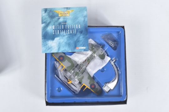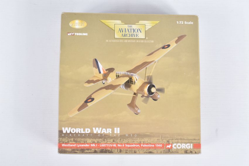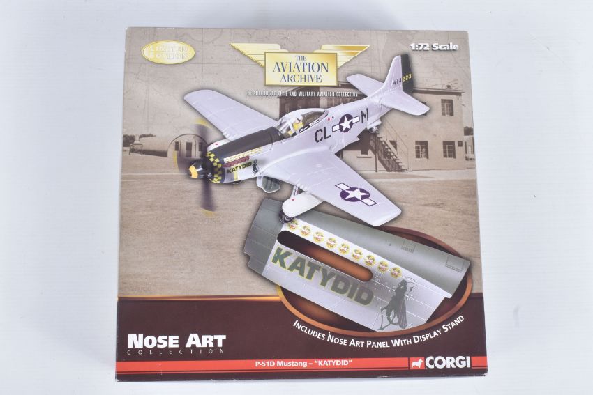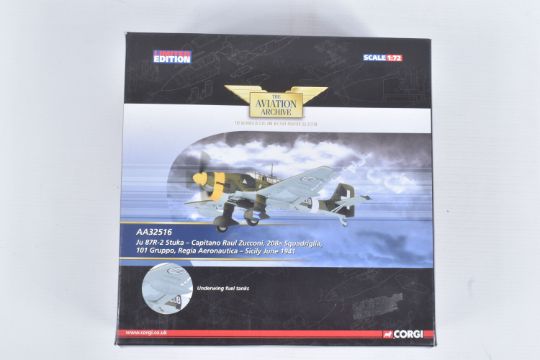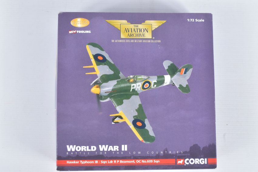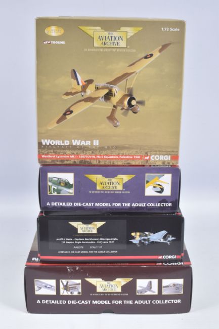 FOUR BOXED CORGI AVIATION ARCHIVE 1:72 LIMITED EDITION MODEL MILITARY AIRCRAFTS, the first a Nose Art Collection P-51D Mustang - katydid, no. US32218, the second a aircraft of the MTO Westland Lysander Mk.1, no. AA36802, a battle for the low countries Hawker Typhoon IB, no. AA36502, lastly a Ju 87R-2 Stuka, no. AA32516, all appear in a new condition, some with internal paperwork, boxes showing wear, mostly to corners and sharp edges