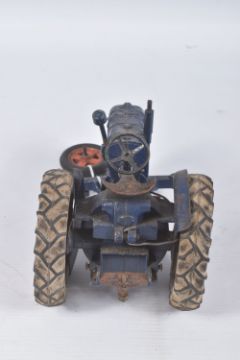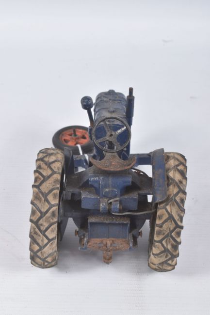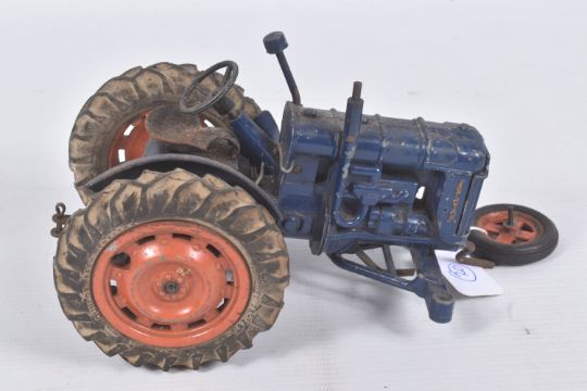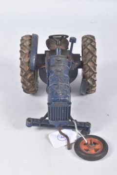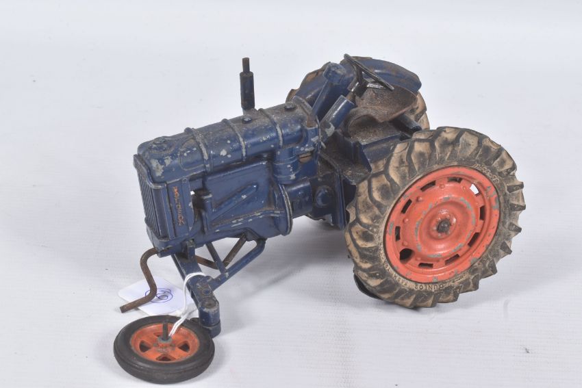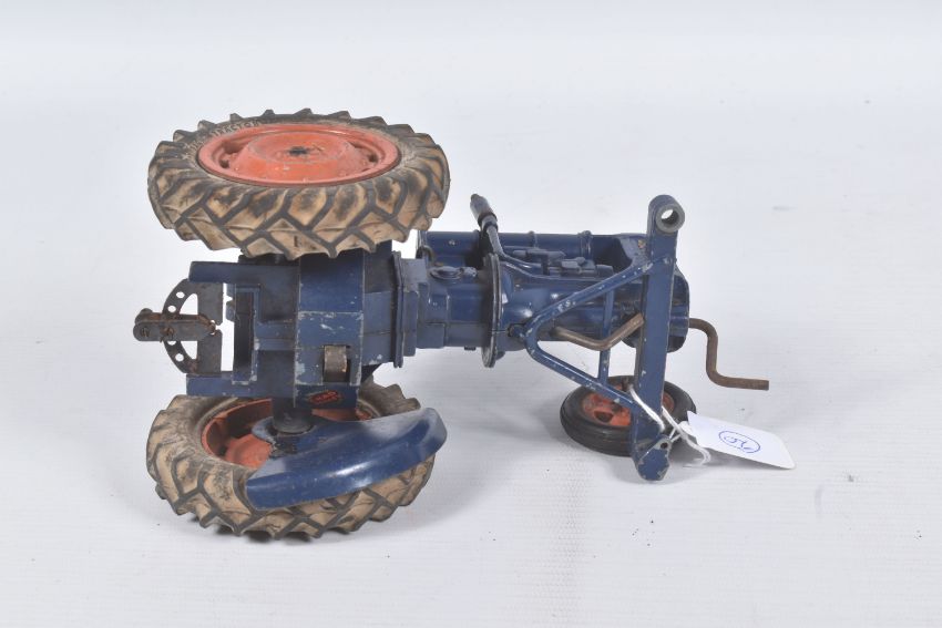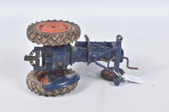 AN UNBOXED CHAD VALLEY CLOCKWORK FORDSON MAJOR E27N TRACTOR, No.9235, 1/16 scale, version wound by starting handle, handle turns but motor does not wind, one front wheel missing, other present but detached from tractor, appears to be missing other steering parts, one mudguard loose, other appears held by wire, playworn condition with paint loss, marking and wear, but has both (bent) exhausts, seat and towing pins