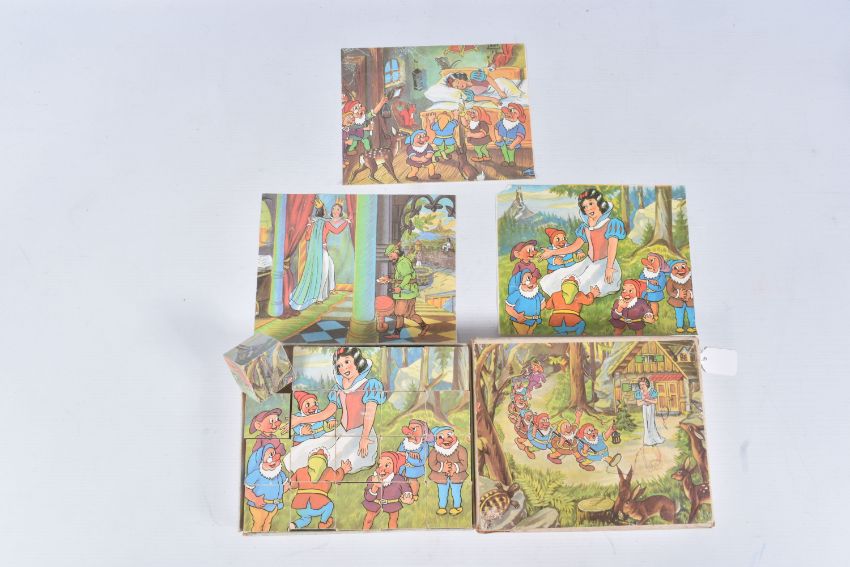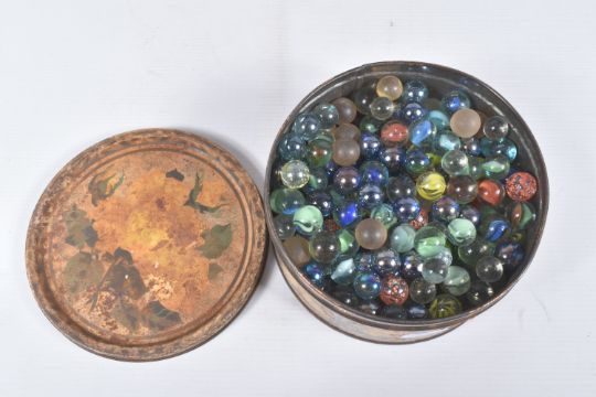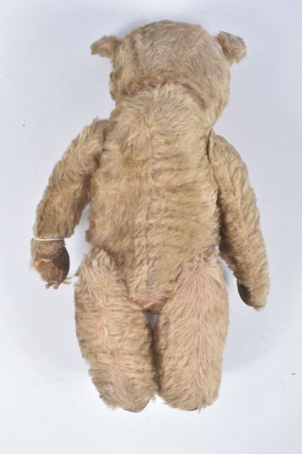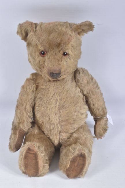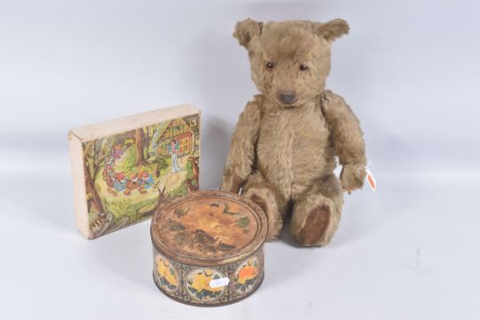 A GOLDEN PLUSH TEDDY BEAR, originally birthday is April 1957, amber and black glass eyes, shaved short muzzle with vertically stitched black nose, jointed body, original velvet pads, one hand pad damaged, kapok filled, in fairly good condition but has some fading, fur loss, marking and wear, no makers mark, height approx. 45cm, boxed Snow White and the Seven Dwarves block puzzle which is complete but in playworn condition and a tin of marbles of assorted sizes and designs, clear & milky glass, plain and decorative etc. (3 items)