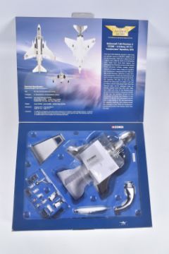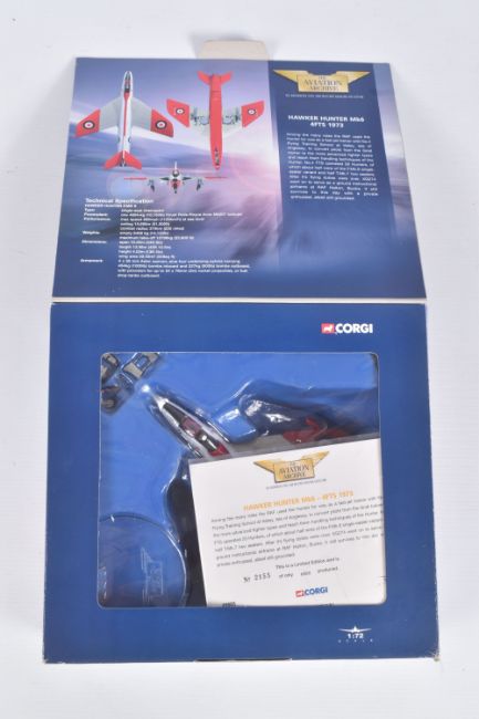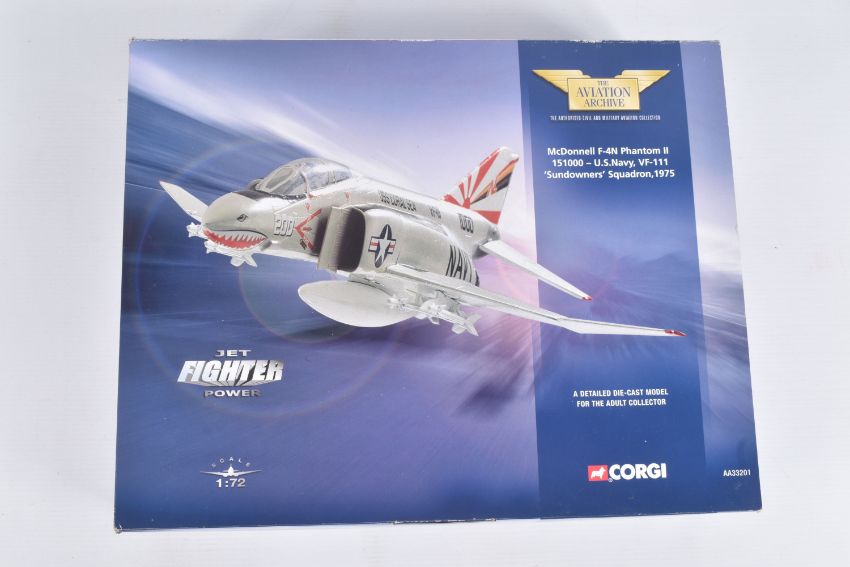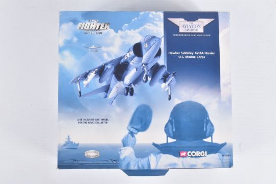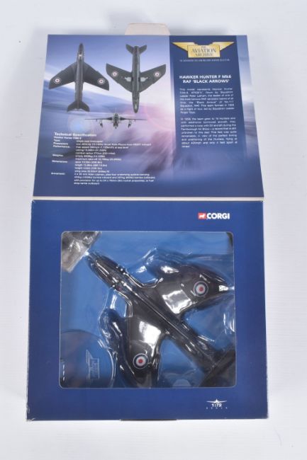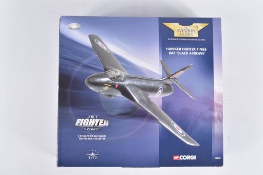 FOUR BOXED CORGI AVIATION ARCHIVE 1:72 MODEL JET FIGHTER POWER MILITARY AIRCRAFTS, the first a McDonnell F-4N Phantom II, no. AA33201, the second a Hawker Siddeley AV-8A Harrier, no. AA32403, the third a Hawker Hunter Mk6 4FTS 1973, no. 49803, lastly a Hawker Hunter F Mk^ RAF 'Black Arrows', no. 49802, all appear in a new condition, some with internal paperwork, boxes showing wear, mostly to corners and sharp edges