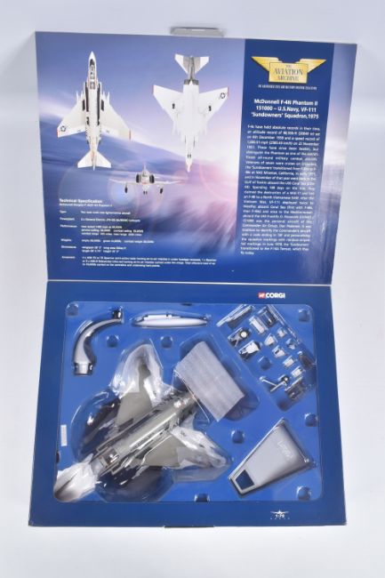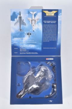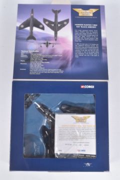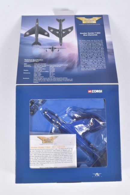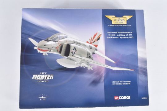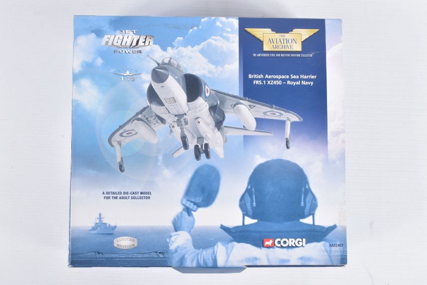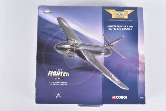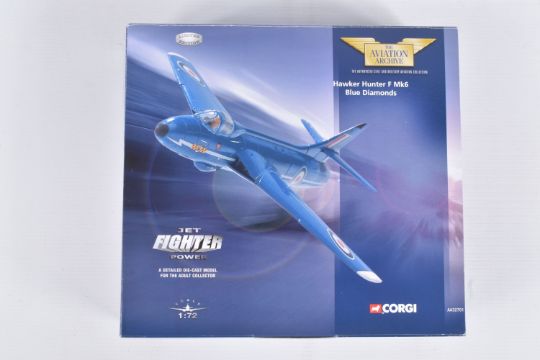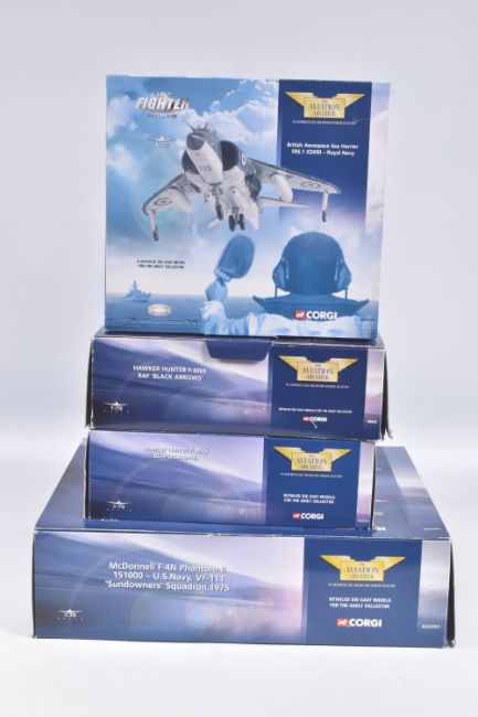 FOUR BOXED CORGI AVIATION ARCHIVE 1:72 MODEL JET FIGHTER POWER MILITARY AIRCRAFTS, the first a McDonnell F-4N Phantom II, no. AA33201, a Hawker Hunter F Mk6 Blue Diamonds, no. AA32701, a Hawker Hunter F Mk6 RAF Black Arrows, no. 49802, lastly a British Aerospace Sea Harrier, no. AA32402, all appear in a new condition, some with internal paperwork, boxes showing wear, mostly to corners and sharp edges