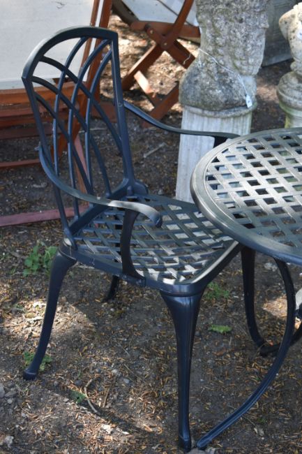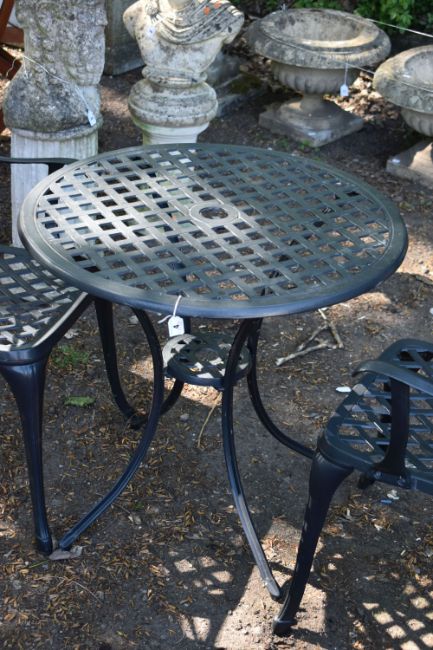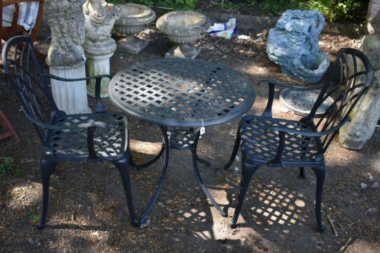 A BLACK CAST ALUMINIUM CIRCULAR GARDEN TABLE, with a lattice detail, diameter 71cm x height 68cm, and a pair of matching chairs, condition reports: table slightly rusted, few brown paint splashed (3)