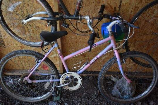 THREE VARIOUS BIKES, to include a Peugeot Etoile road bike, with a 24 '' frame, a Raleigh boys bike, with a 18 '' frame, a Raleigh pink girls bike with a 16 '' frame, and a child's helmet, condition report: all untested for durability (4)